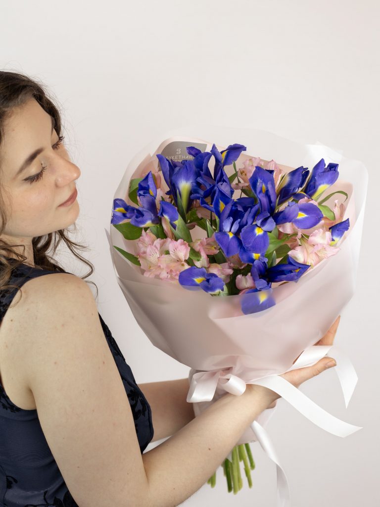 Букет из ярких весенних ирисов и нежных альстромерий. Все букеты мы доставляем на аквапакетах. А в подарок даём подкормку и инструкцию по уходу за букетом.