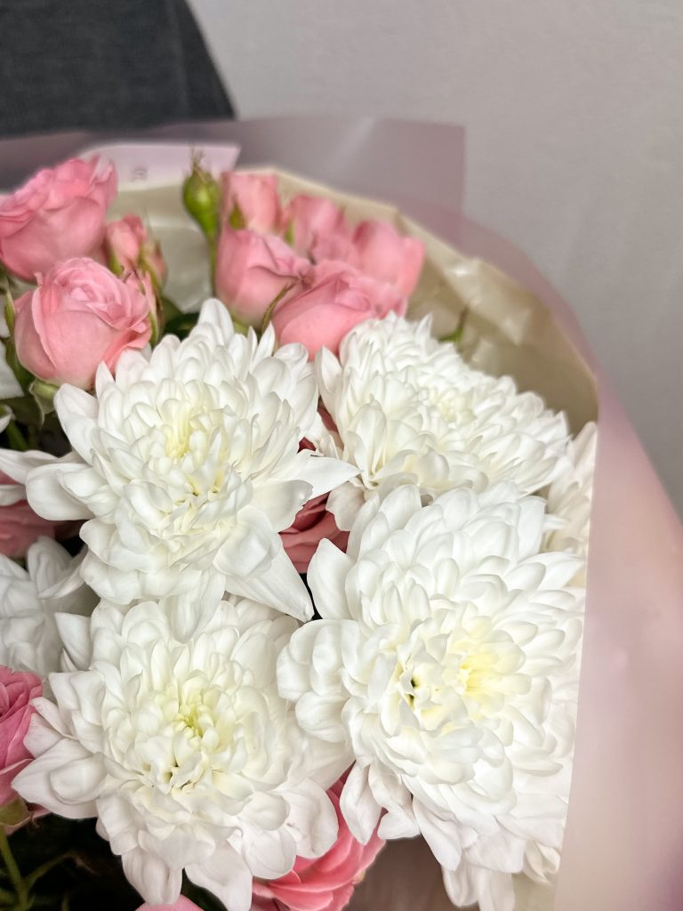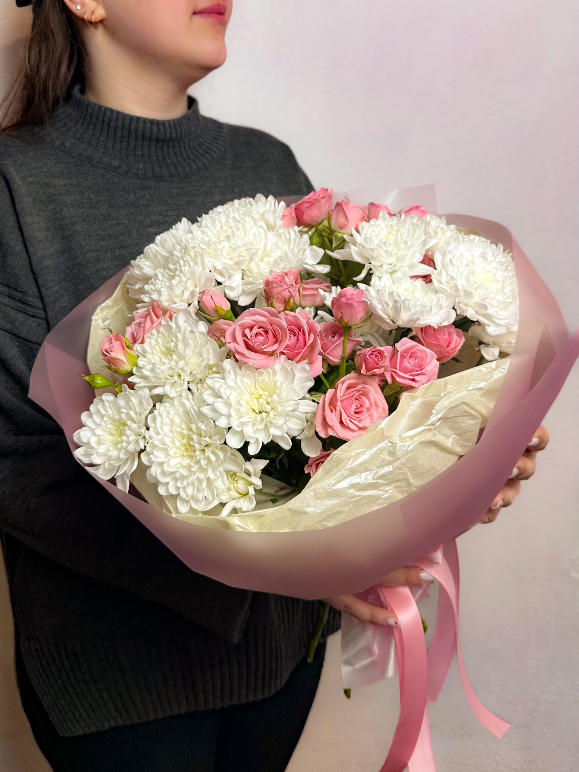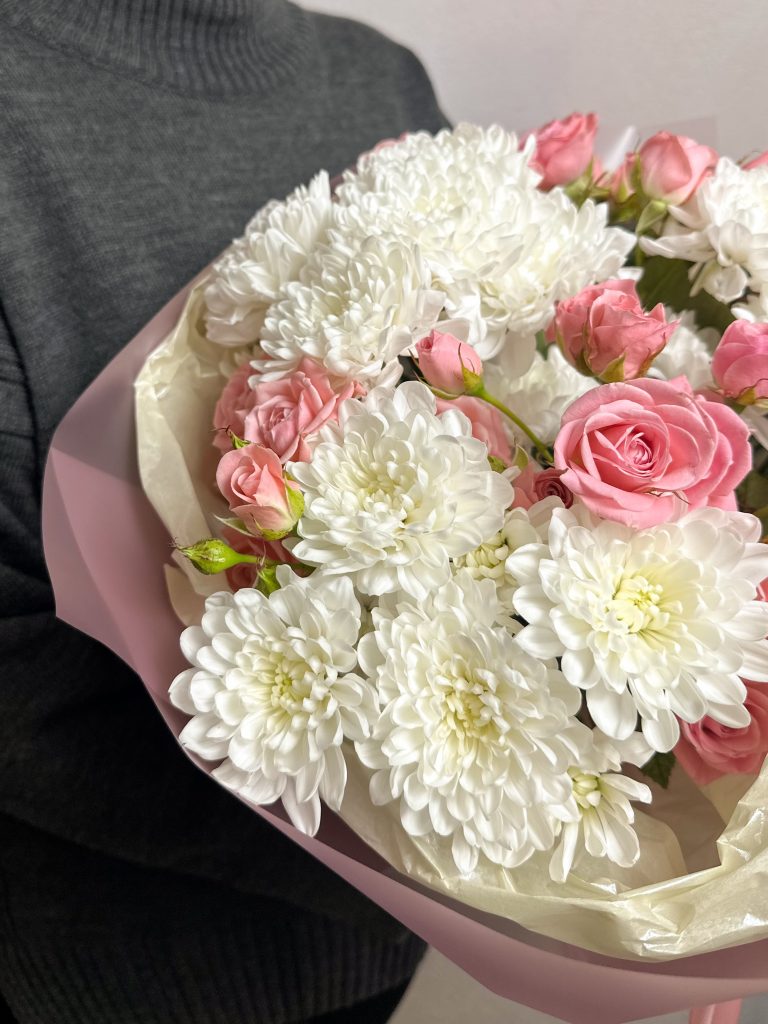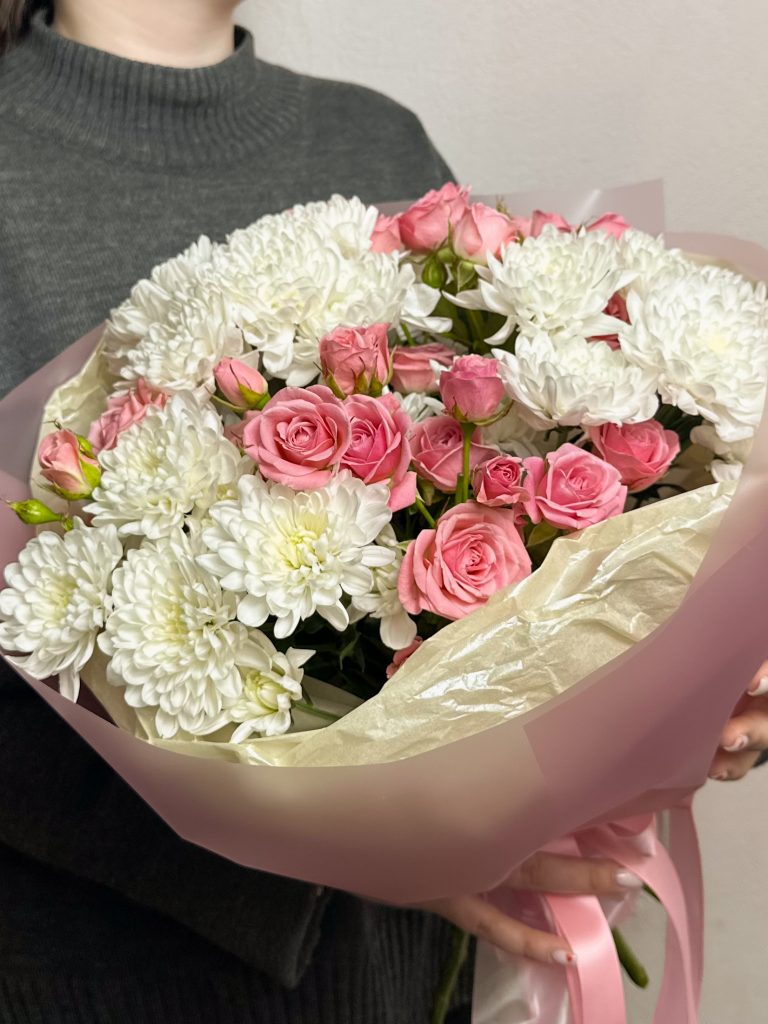 Букет из кустовой розы и хризантемы Алтай, легкий, пышный, ненавязчивый и стойкий Все букеты мы доставляем на аквапакетах. А в подарок даём подкормку и инструкцию по уходу за букетом.