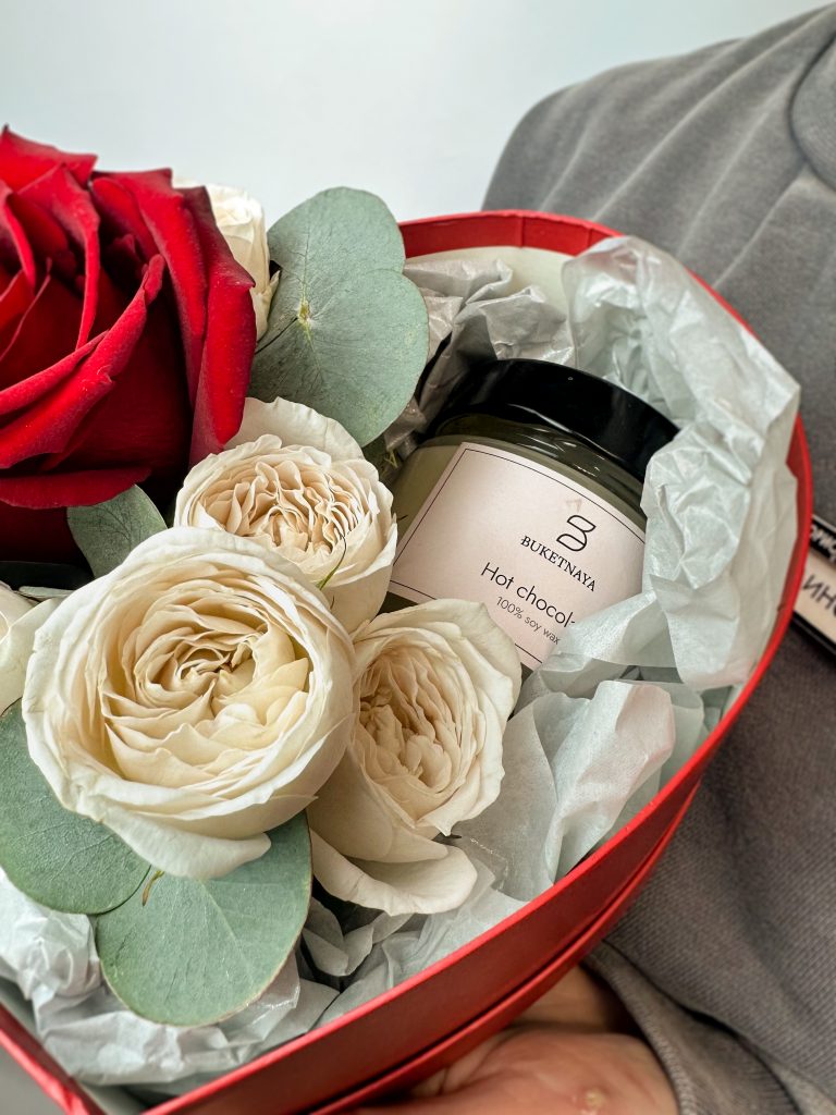 Яркий бокс с розами и авторской свечой. Все букеты и композиции мы доставляем на аквапакетах. А в подарок даём подкормку и инструкцию по уходу за букетом.