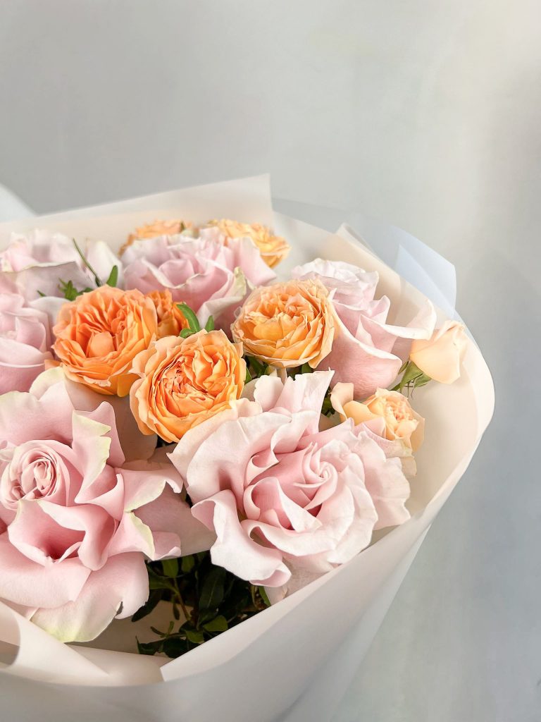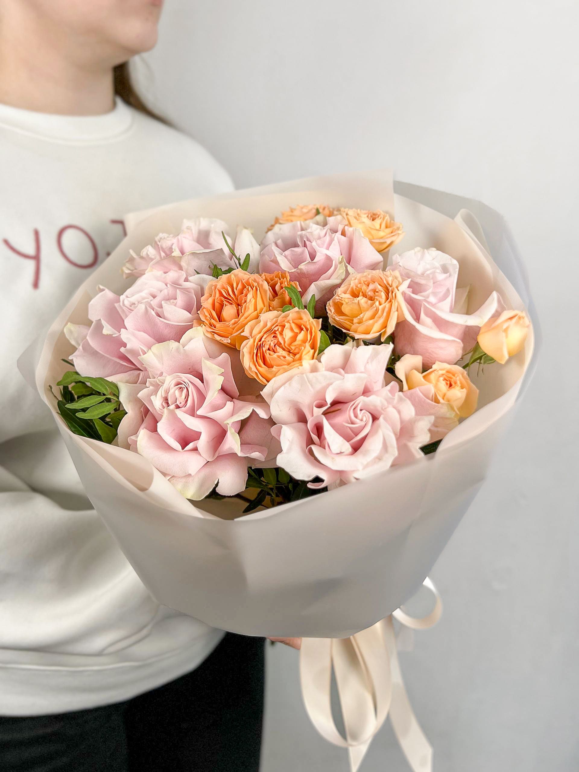 Букет из нежных рукотворных французских роз с ярким компаньоном - кустовой розой Фибоначчи