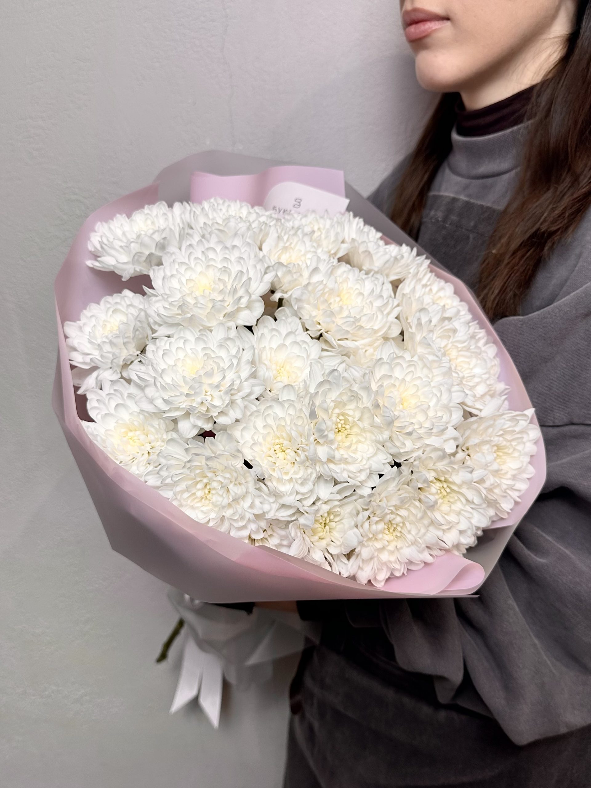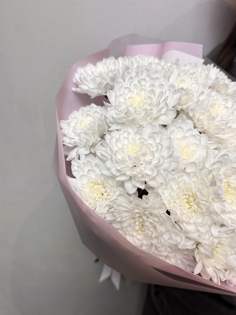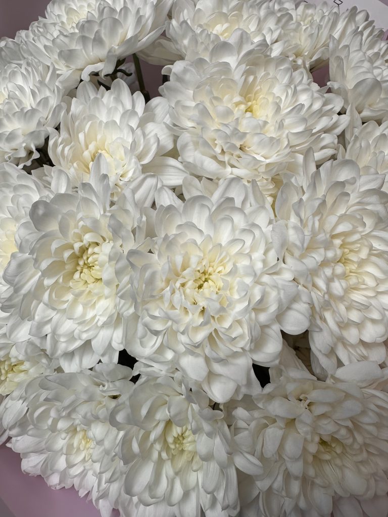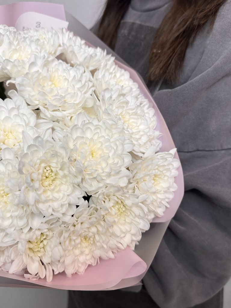 Хризантема Алтай с крупными соцветиями пышными как зефир Все букеты мы доставляем на аквапакетах. А в подарок даём подкормку и инструкцию по уходу за букетом.