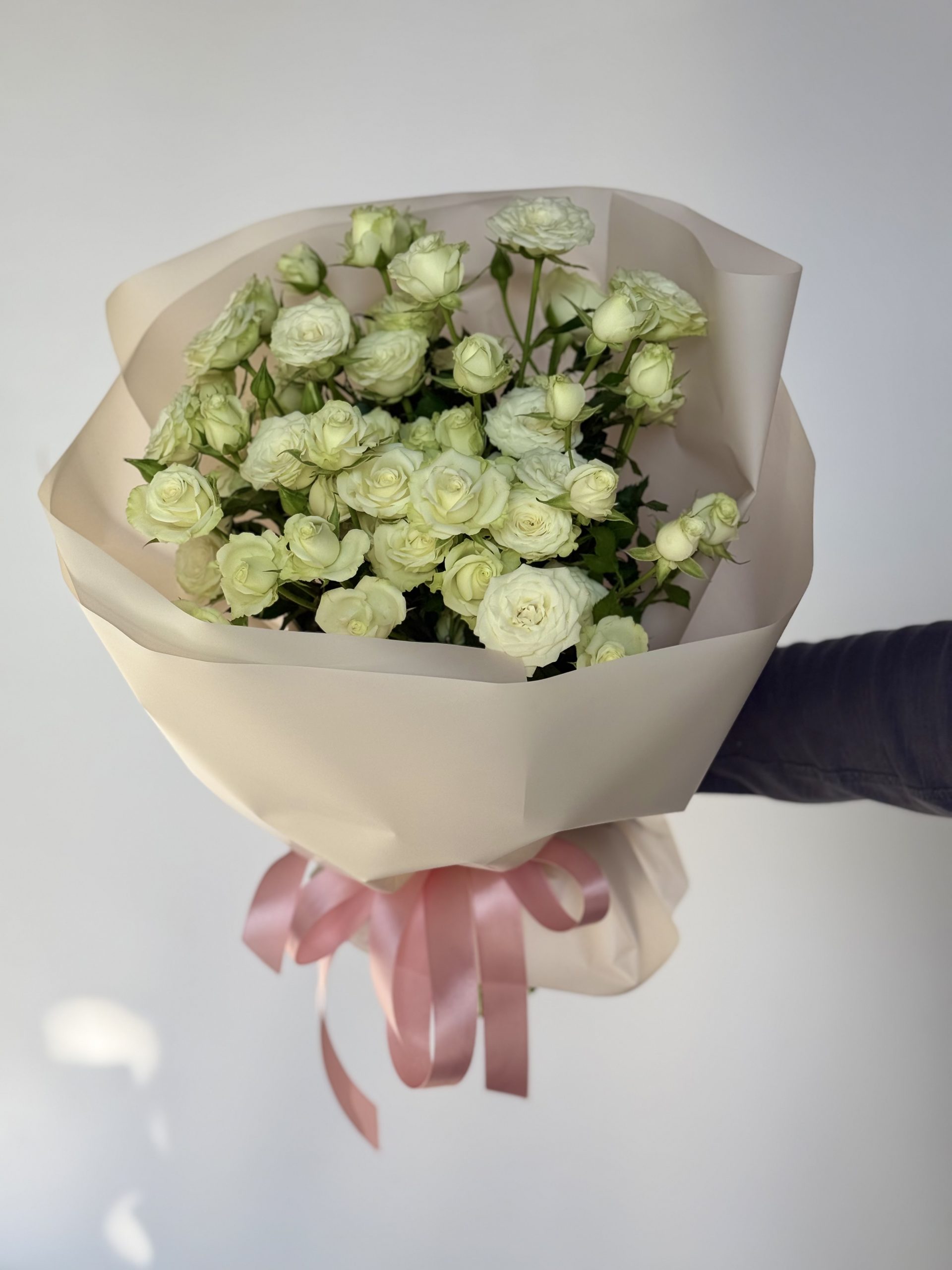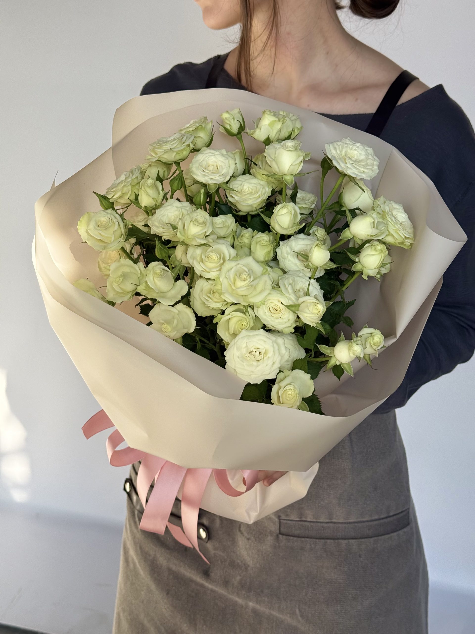 Букет из 7 веточек белой кустовой розы в упаковке К каждому букету мы прикладываем пакетик цветочной подкормки. И бережно упаковываем букеты от холода