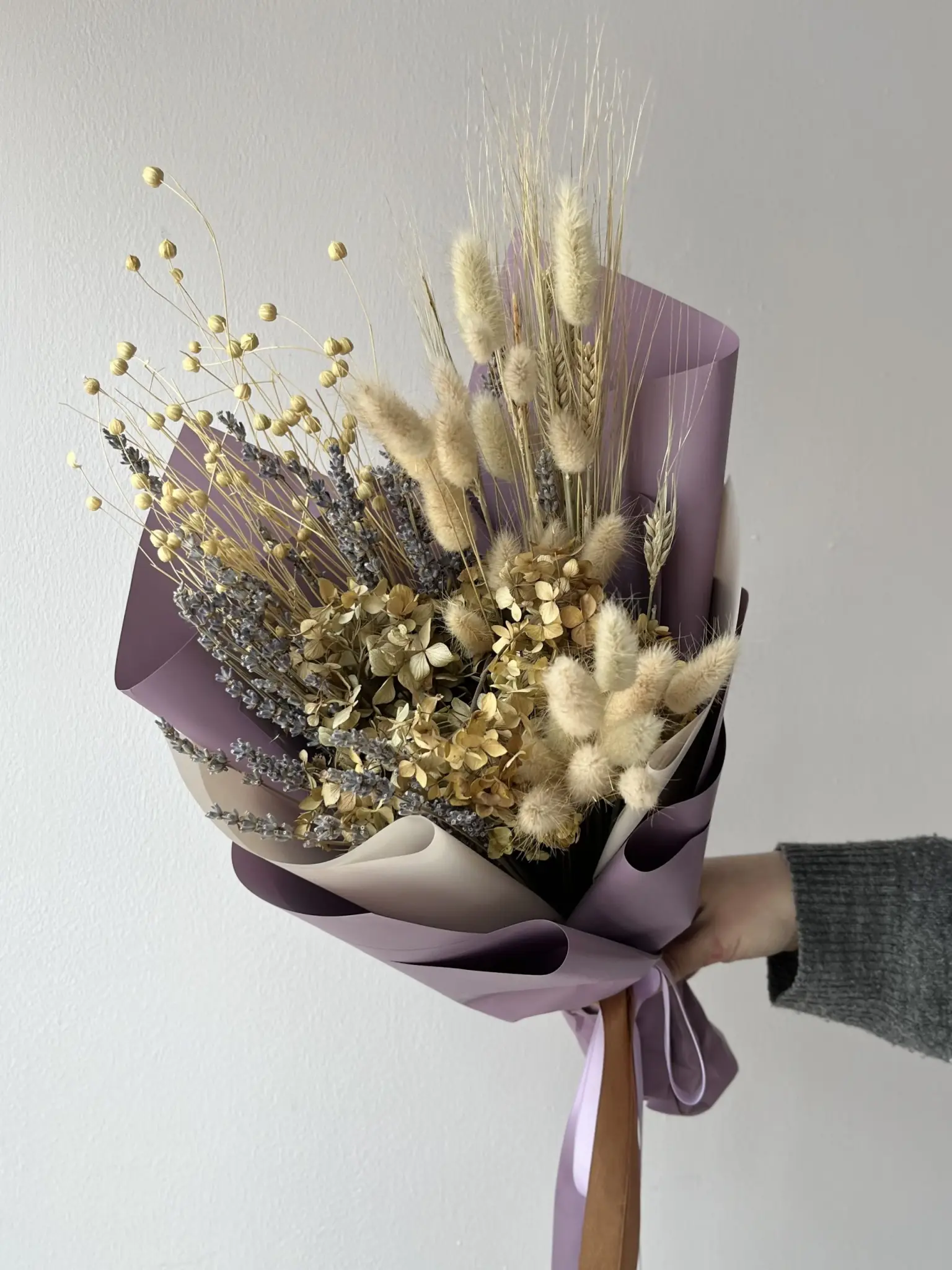 Букет из сухоцветов с льном «Сочи», гортензией «Сочи», лавандином, лагурусом и пшеницей — это гармоничная композиция, сочетающая нежность, текстурность и природную элегантность. Такой букет выглядит одновременно воздушно и насыщенно, создавая эффект многослойности и глубины.