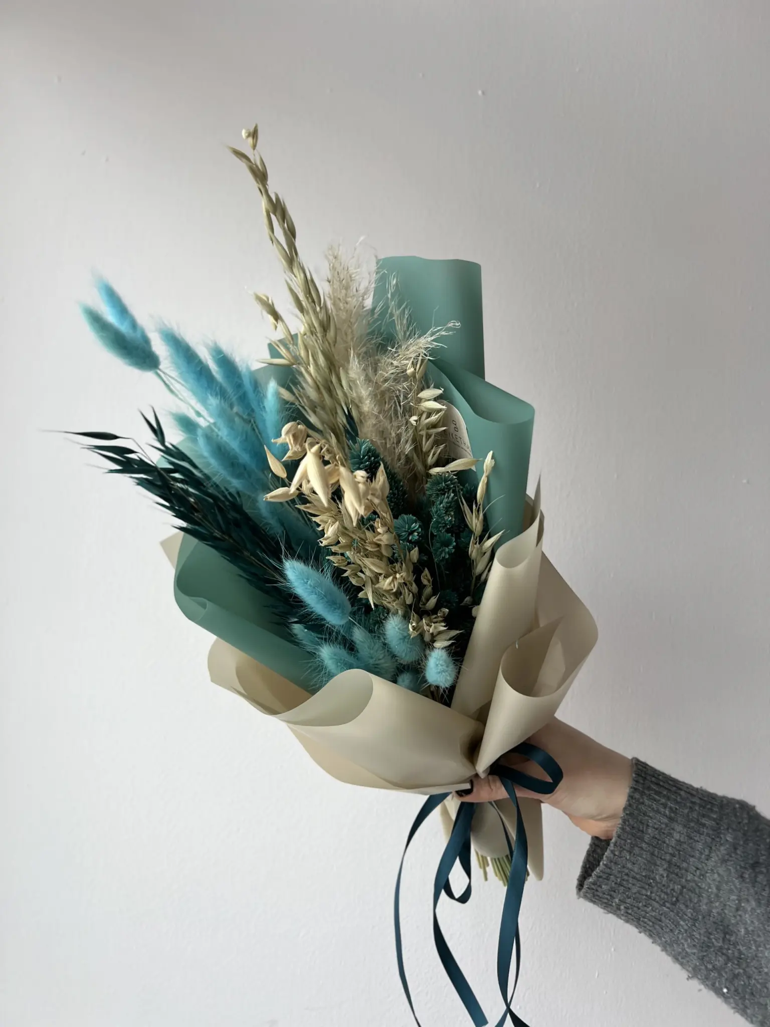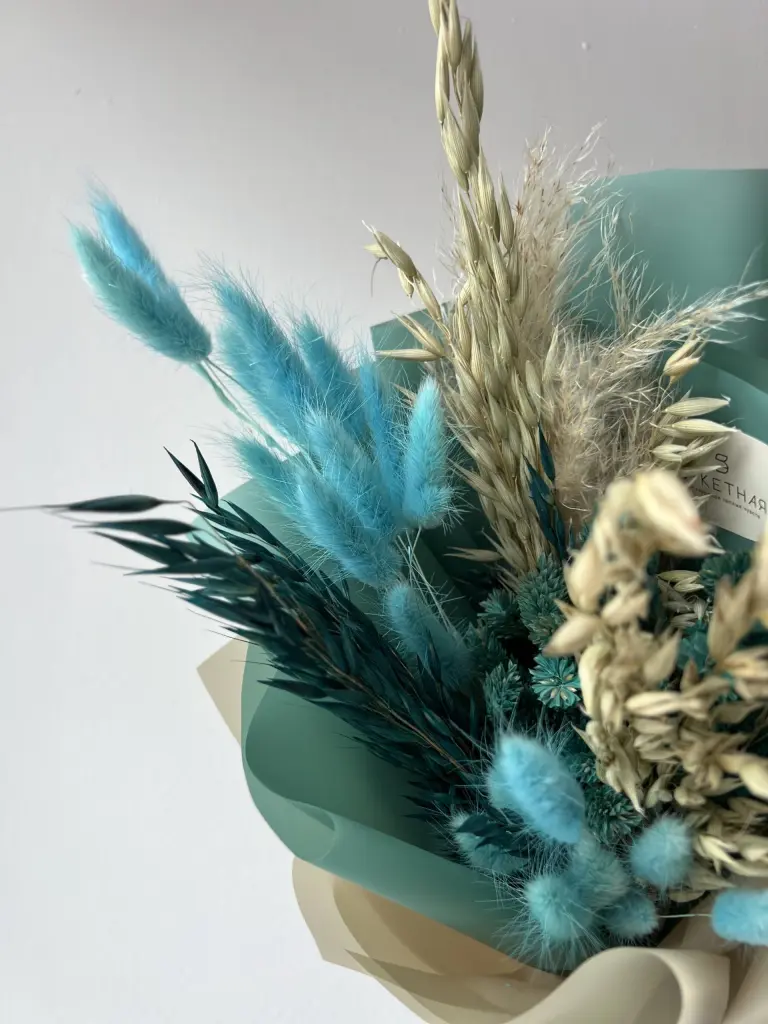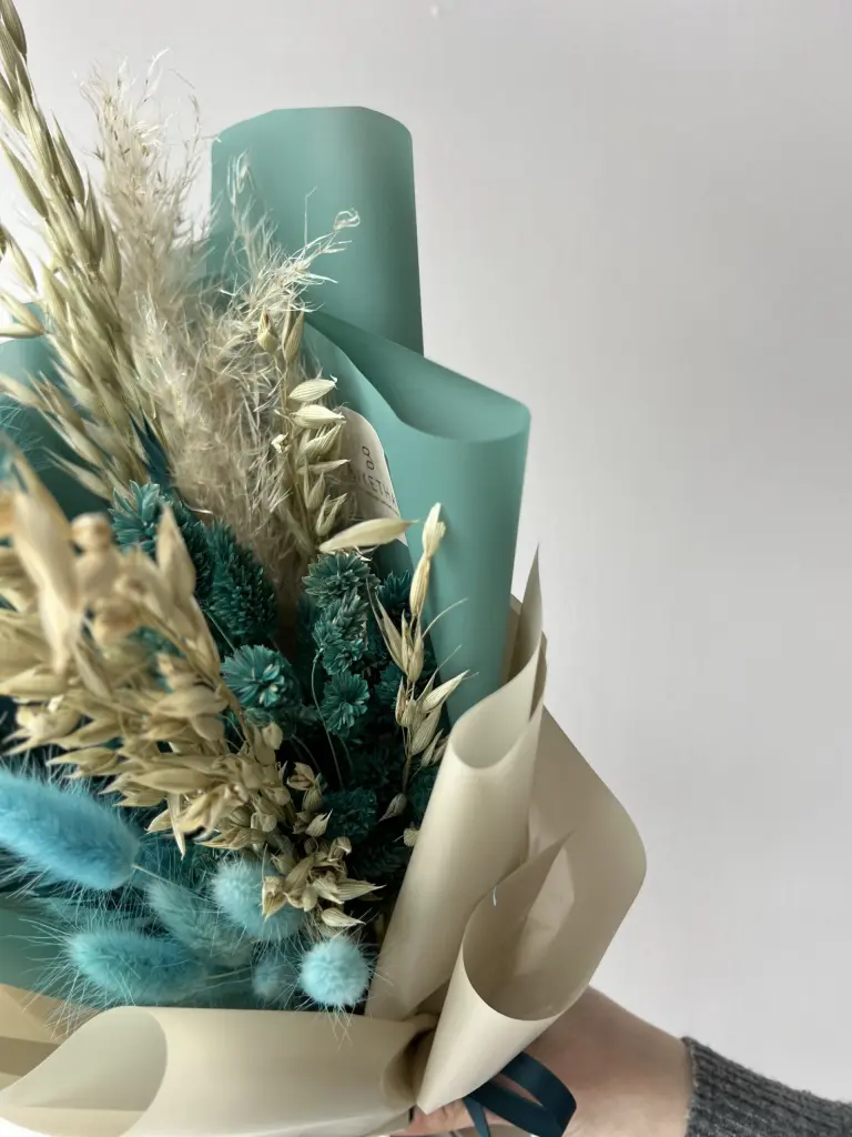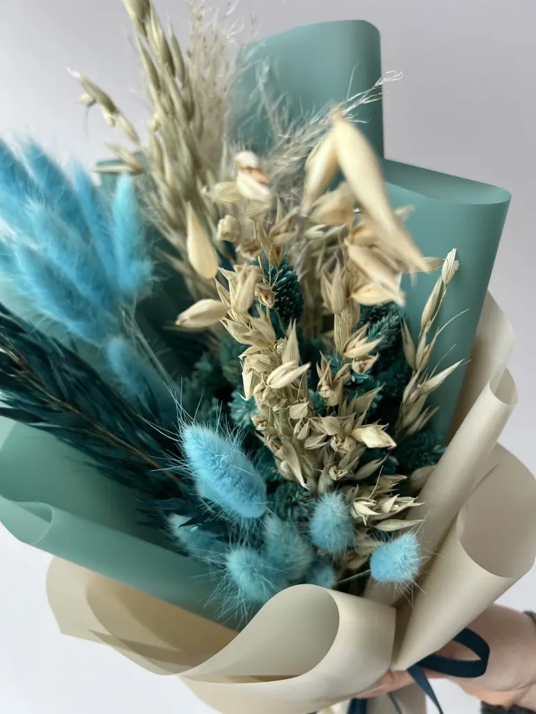 Букет из сухоцветов с лагурусом, гортензией «Сочи» и просом «Сочи» в лазурной гамме — это свежая, воздушная композиция, вдохновлённая оттенками неба и моря. Он выглядит легко, элегантно и при этом остаётся выразительным акцентом в интерьере.