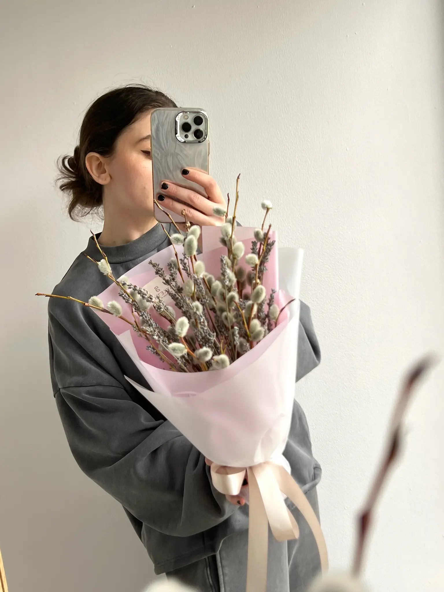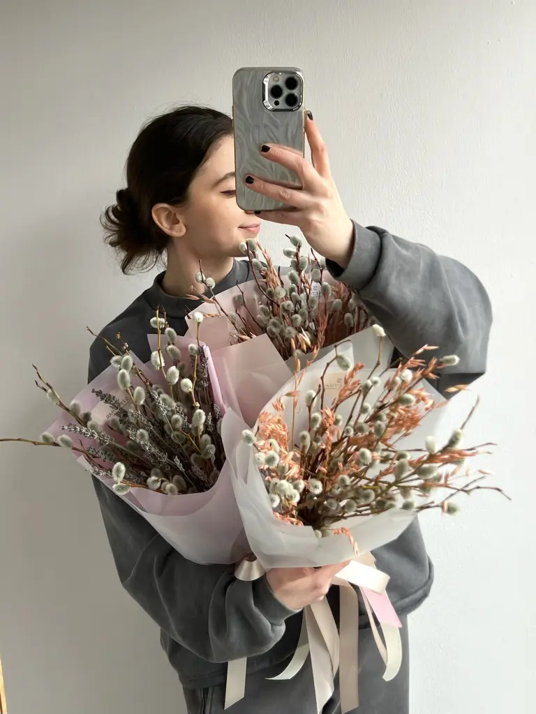 Букет из вербы с сухоцветом лаванды — сдержанная и стильная композиция с весенним настроением.