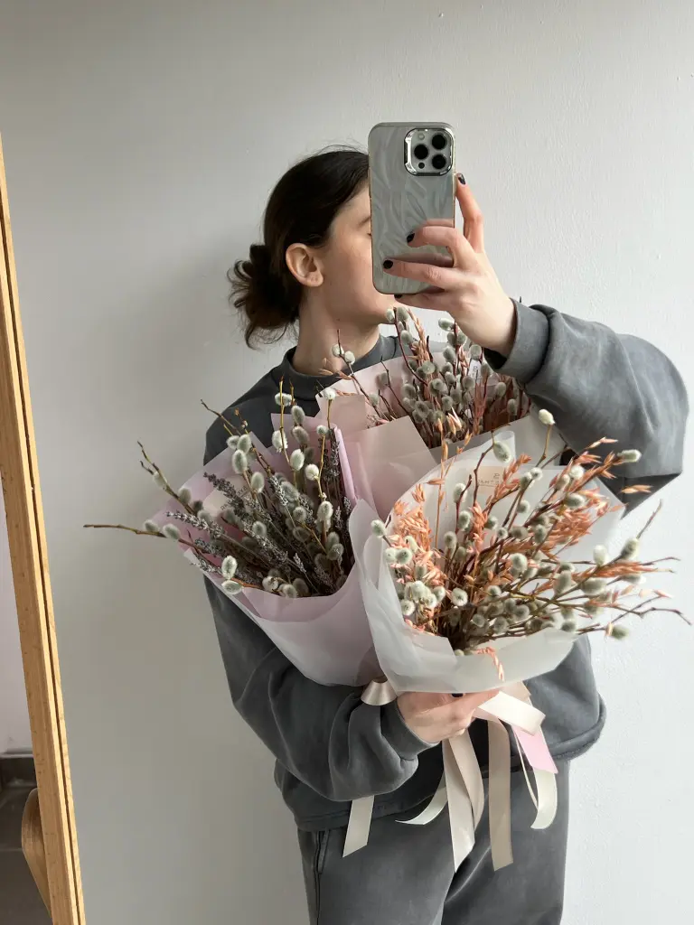 Пушистые ветки вербы сочетаются с фактурным овсом, создают мягкий акцент в интерьере и подходят для подарка на Вербное воскресенье или без повода. В составе — свежая верба и сухоцвет овса. Букет выглядит лаконично, долго сохраняет форму и не требует сложного ухода.