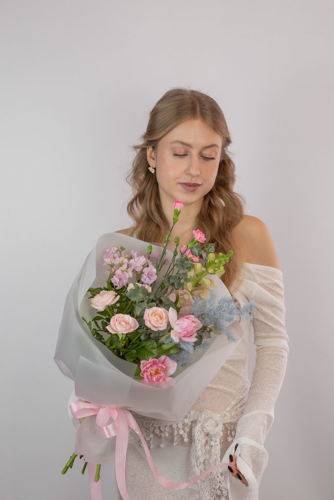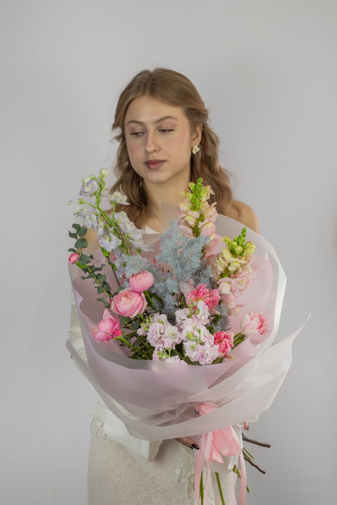 Составной букет в нежных розово-голубых тонах. Все букеты мы доставляем на аквапакетах. А в подарок даём подкормку и инструкцию по уходу за букетом.