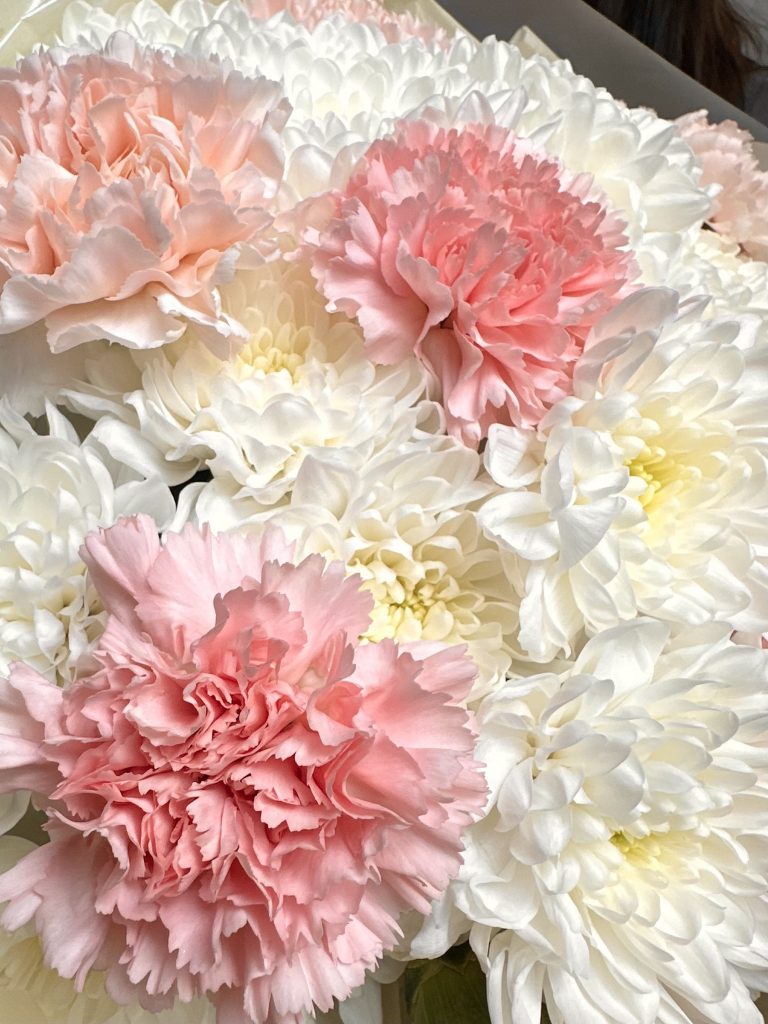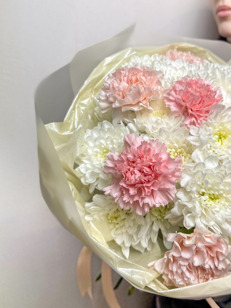 Дуо букет из нежной пышной хризантемы Алтай и розовой гвоздики, нежный, ненавязчивый и очень стойкий