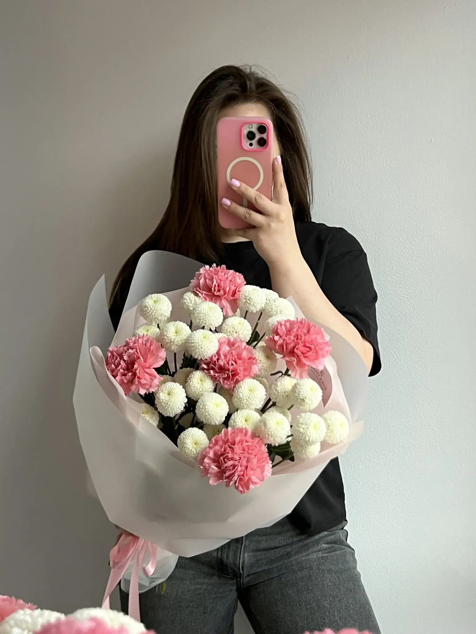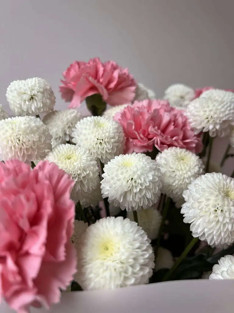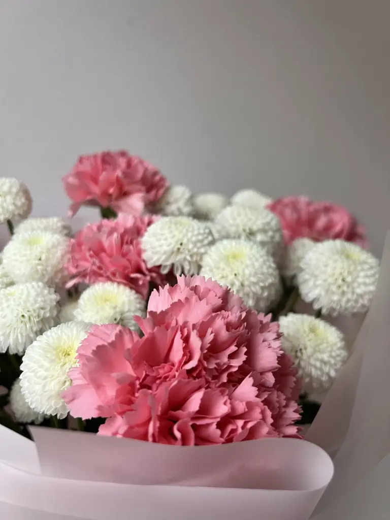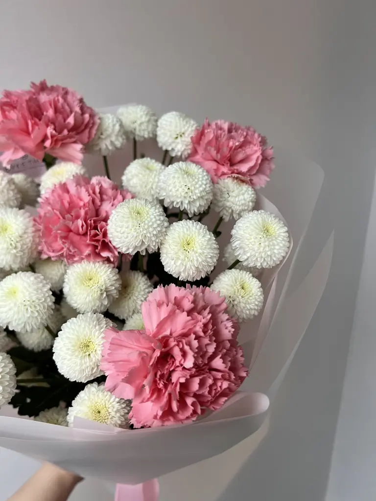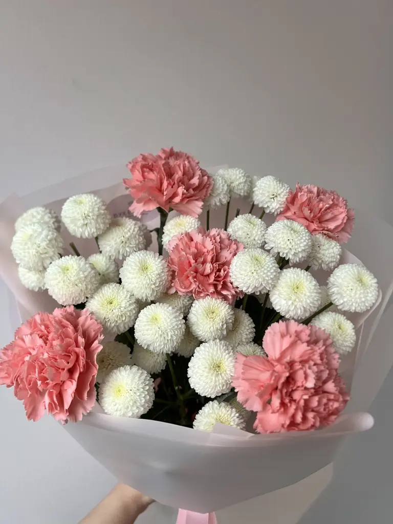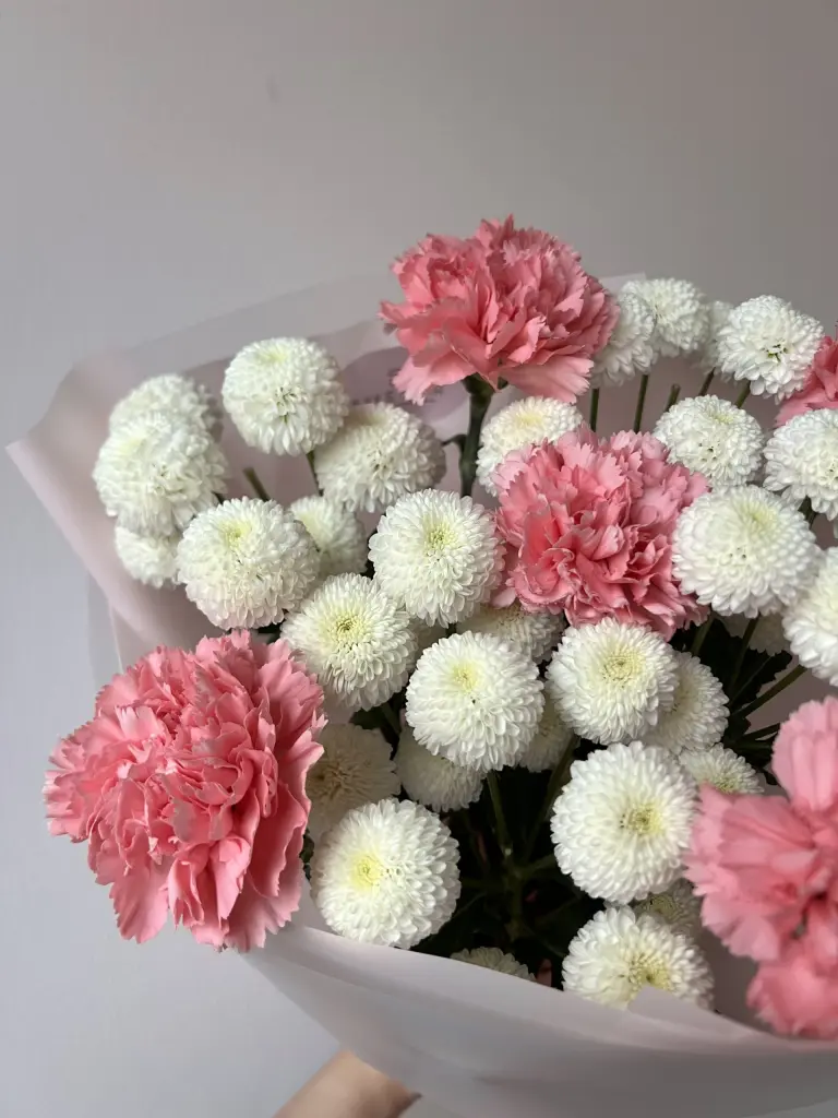 Дуобукет из хризантемы Ньютон и диантуса .
