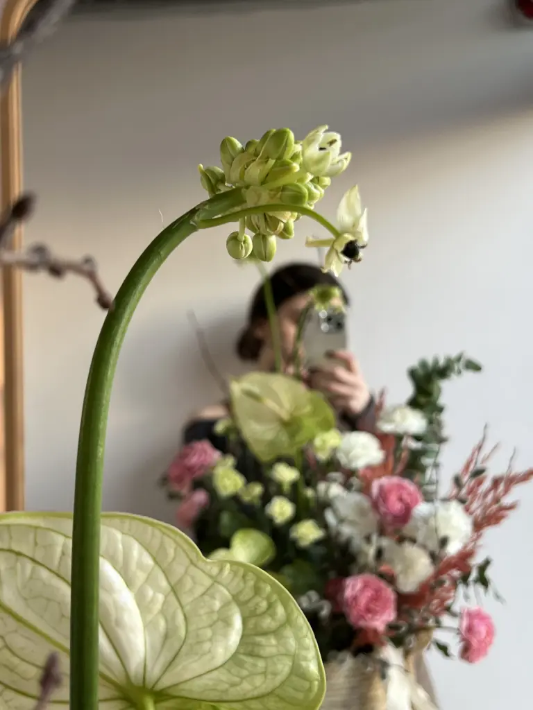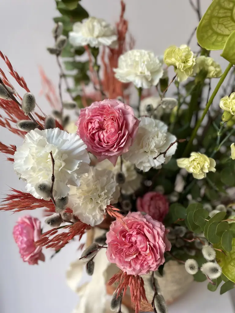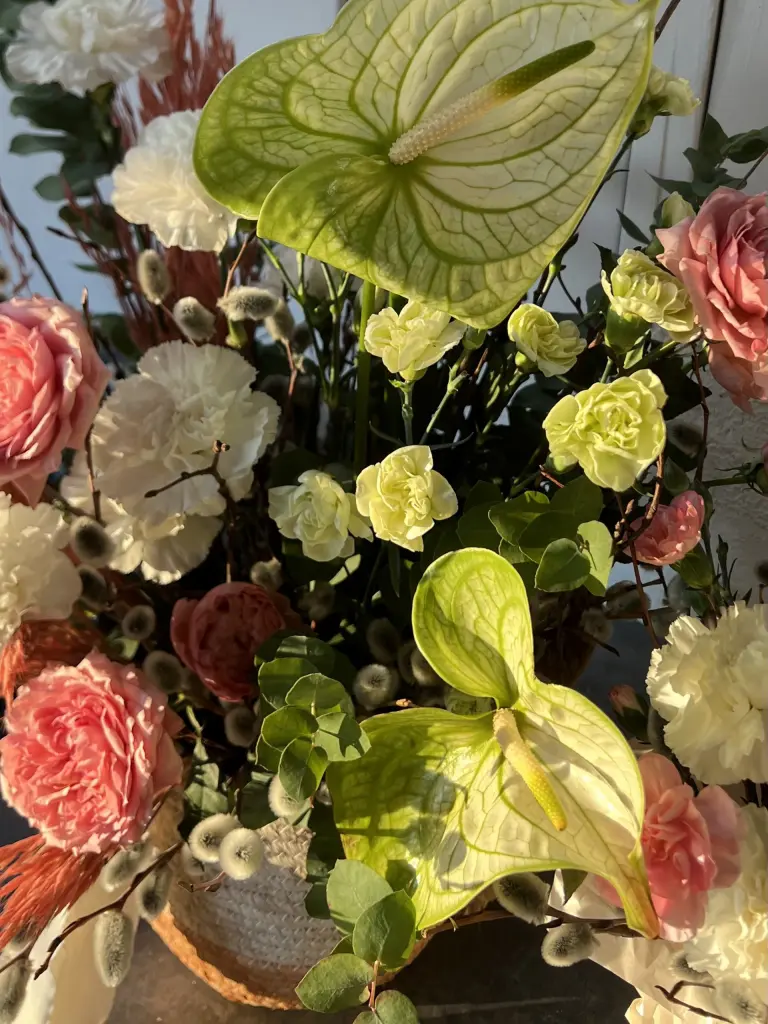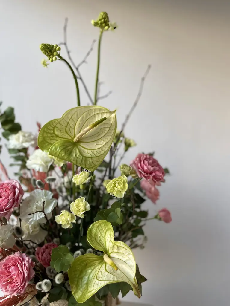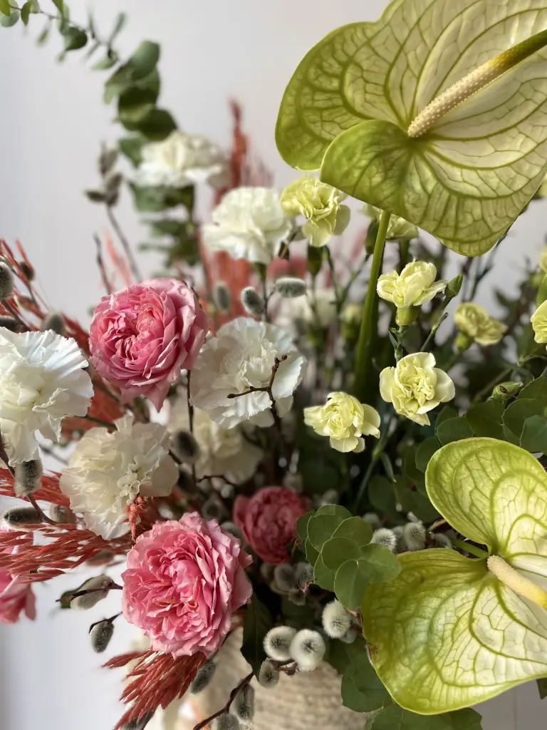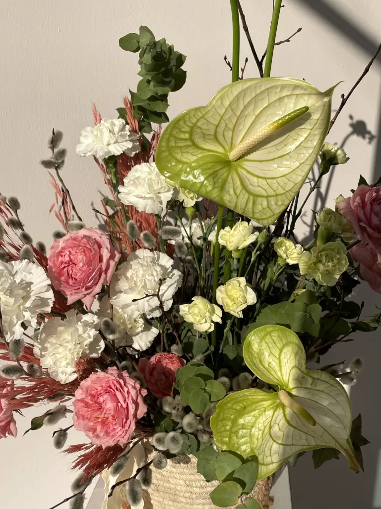 Антуриум добавляет акцент и выразительность, кустовая пионовидная роза Джульетта — объем и мягкость, гвоздика и спирея создают текстуру, орнитогалум добавляет свежесть.