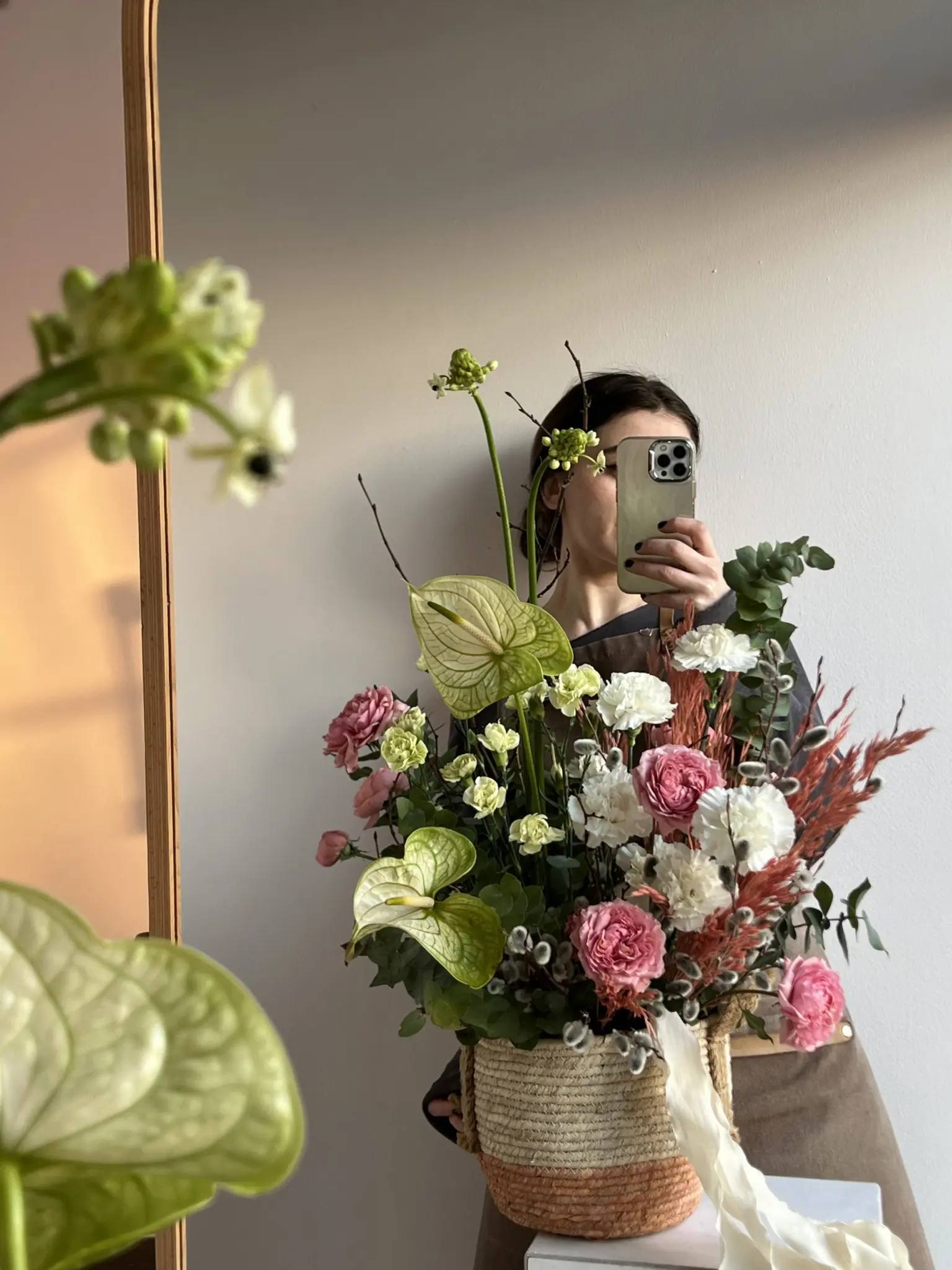 Композиция в флористической губке с антуриумом, спиреей, гвоздикой, кустовой пионовидной розой Джульетта и орнитогалумом в кашпо — это современный вариант цветочной композиции в коробке.