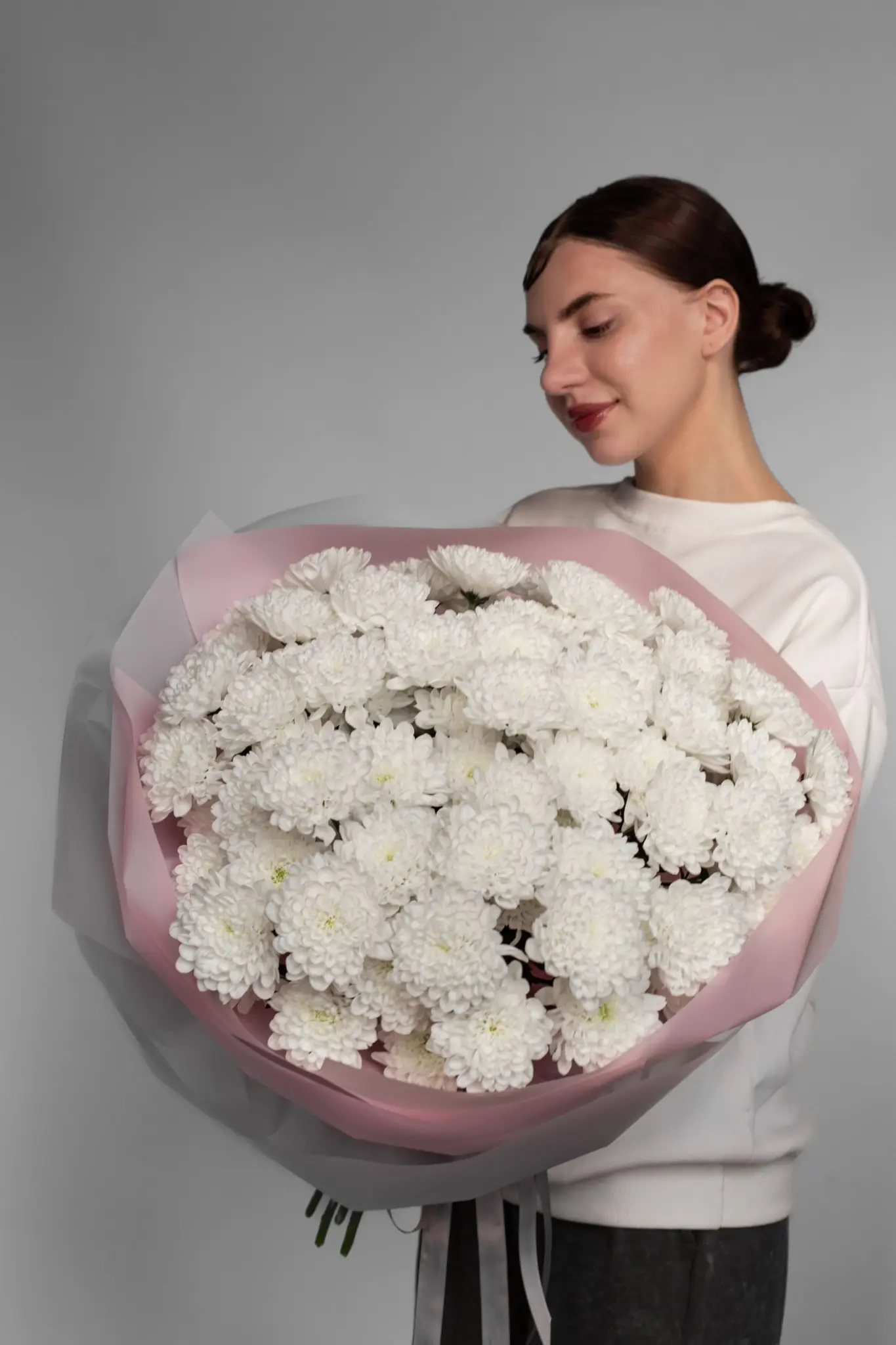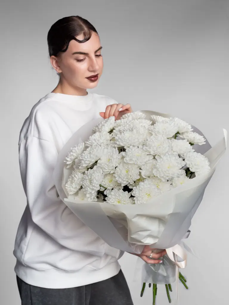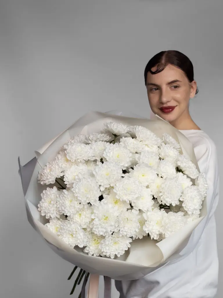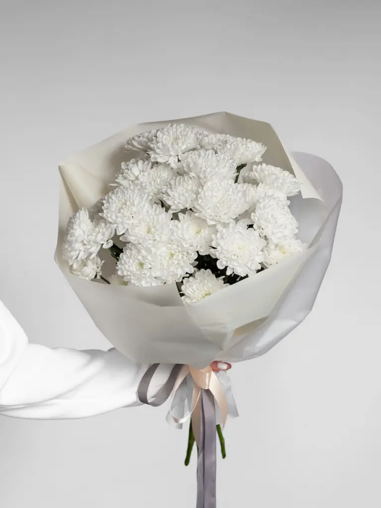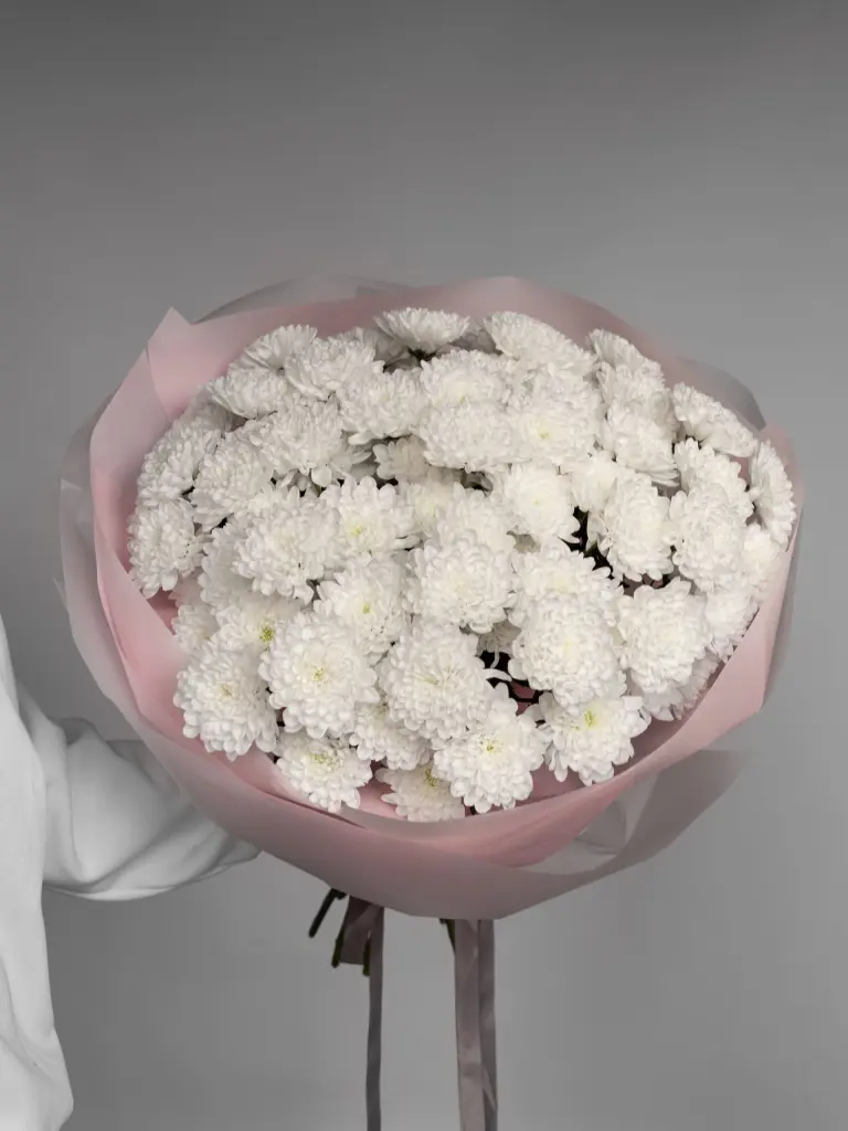 Моно букет из пышной хризантемы Алтай. Соберем любое количество под ваш бюджет. Все букеты мы доставляем на аквапакетах. А в подарок даём подкормку и инструкцию по уходу за букетом