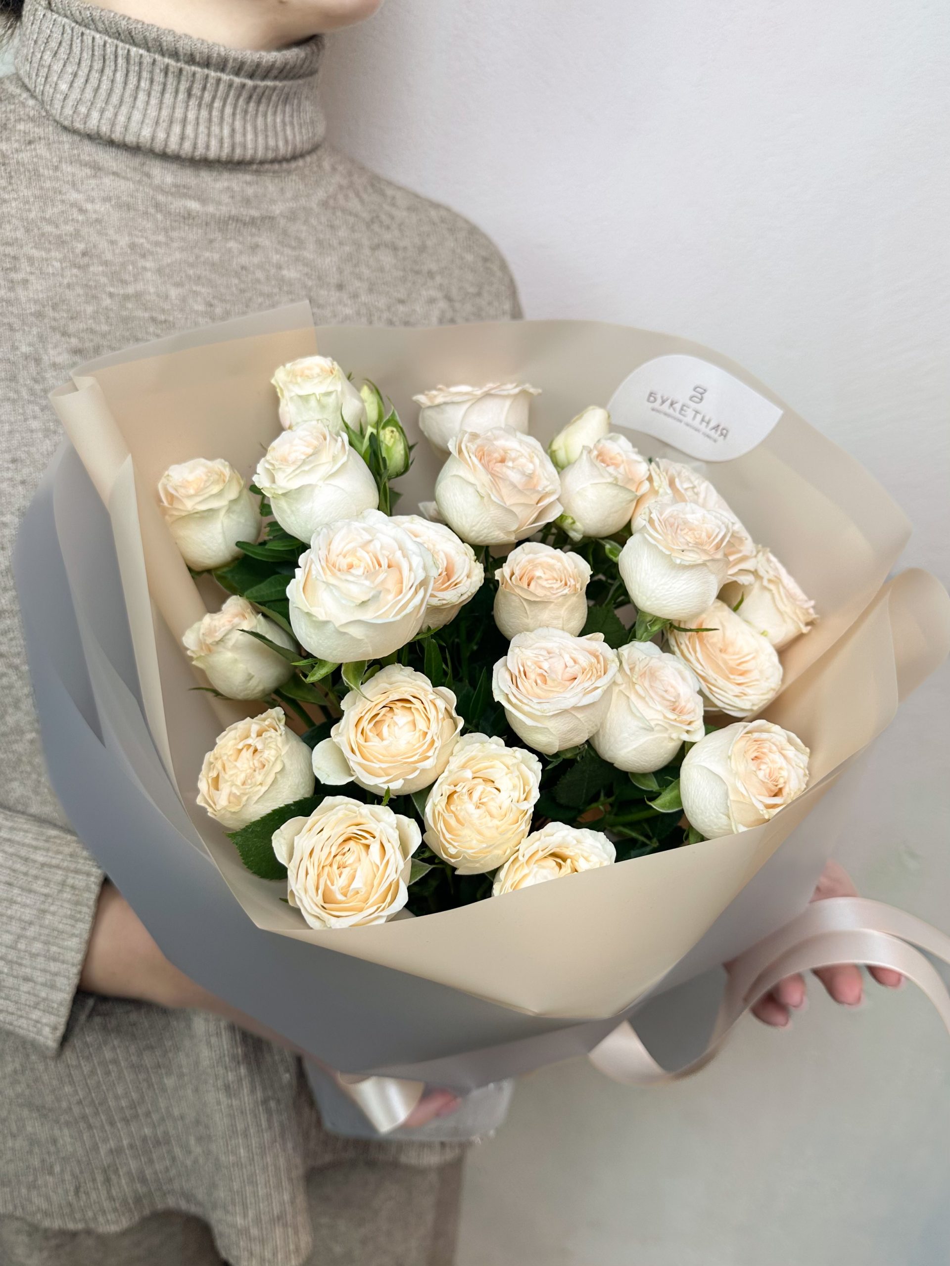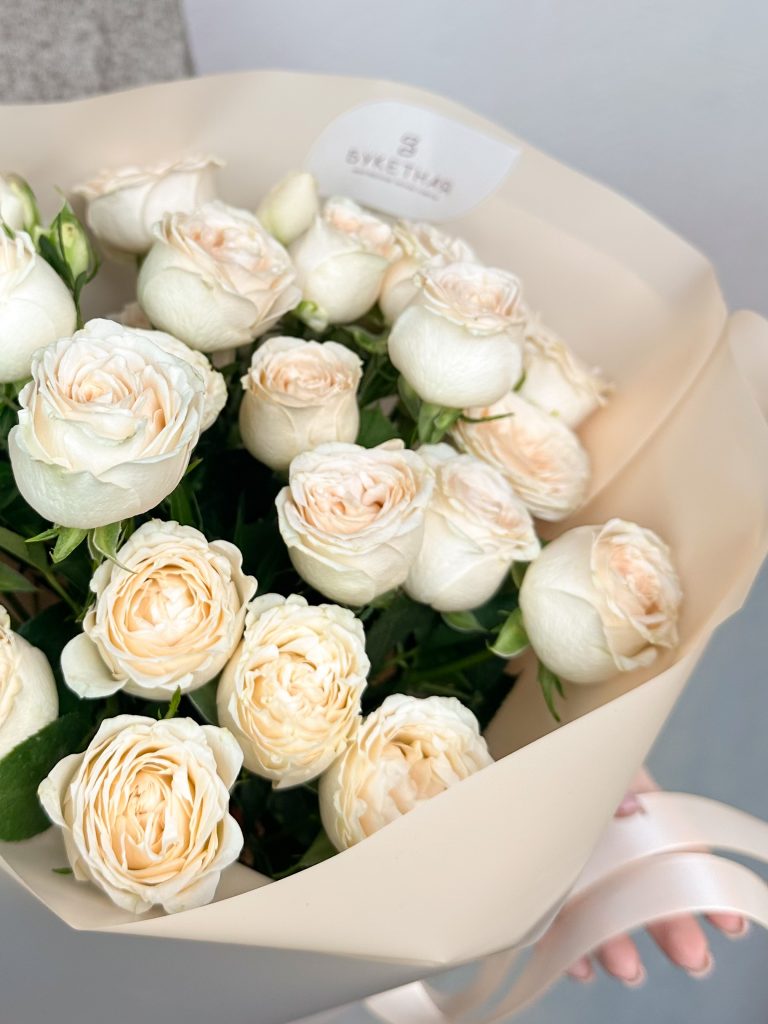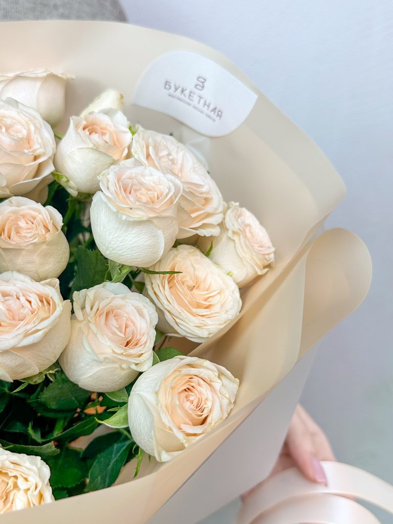 Моно букет из кремовой кустовой розы «София», нежный, ненавязчивый и стойкий Все букеты мы доставляем на аквапакетах. А в подарок даём подкормку и инструкцию по уходу за букетом.