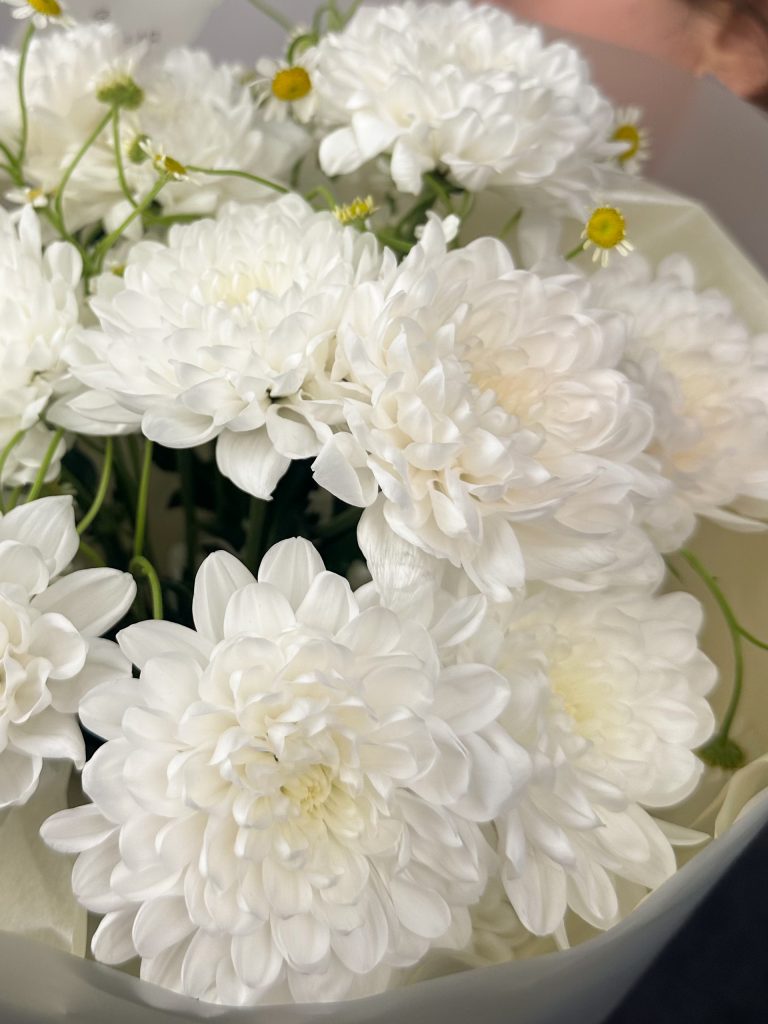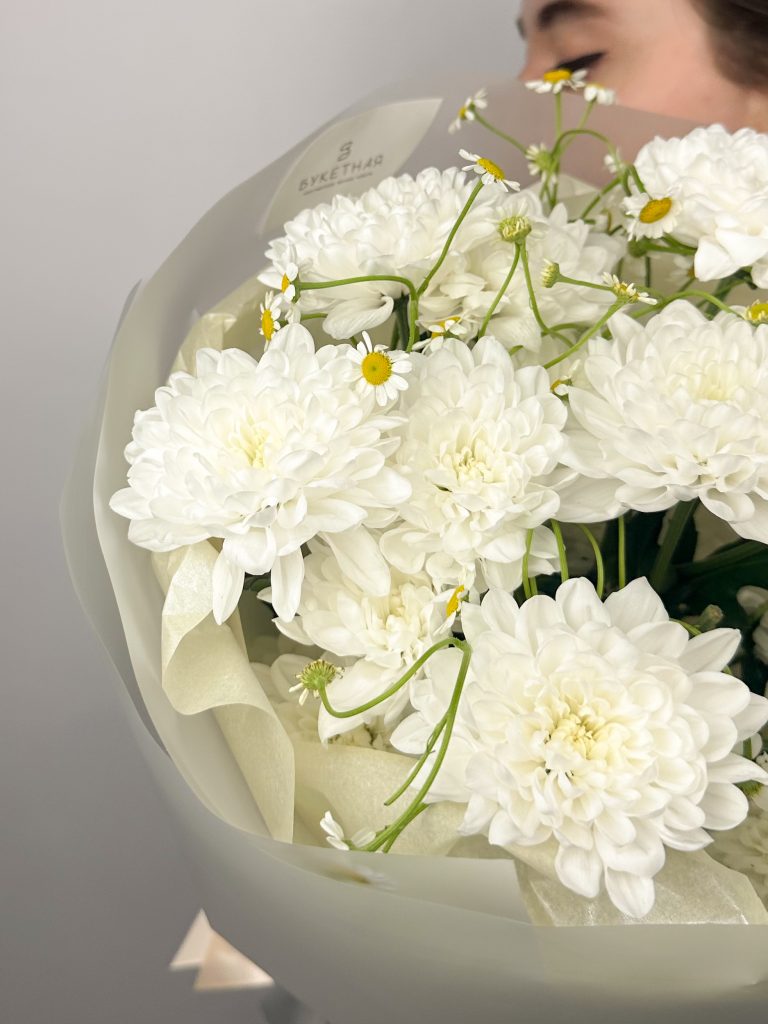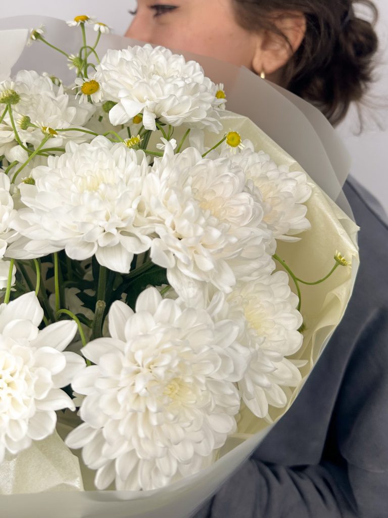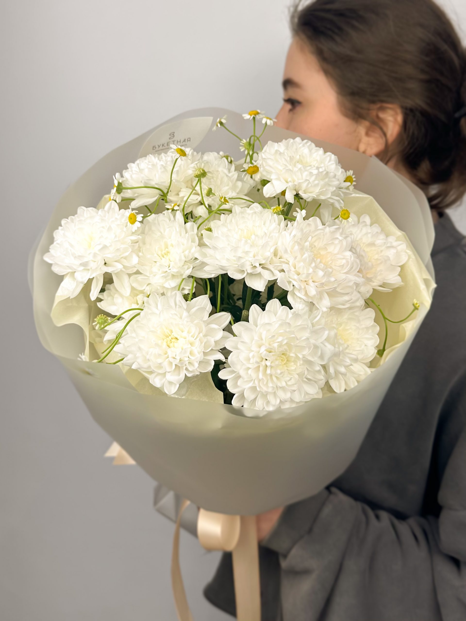 Нежный букет из танацетума (ромашки) и хризантемы Алтай.
