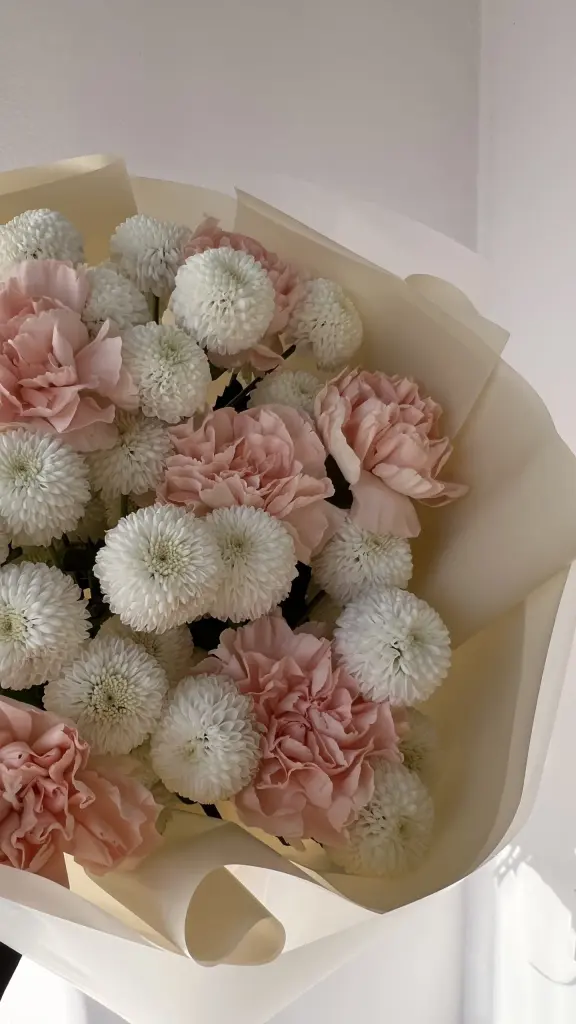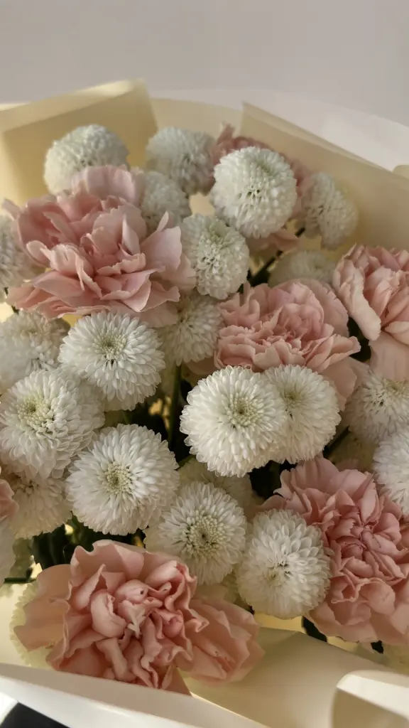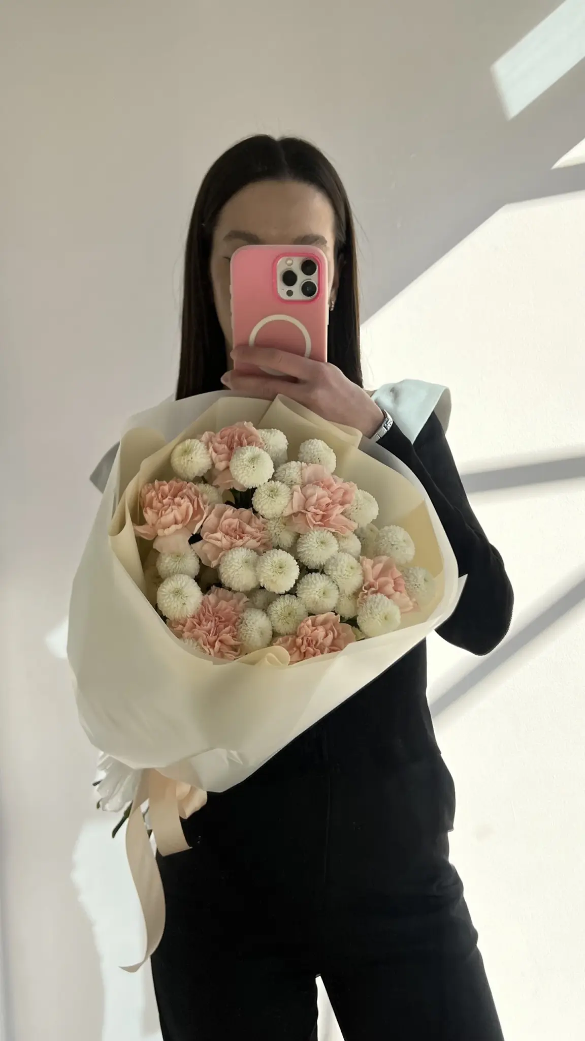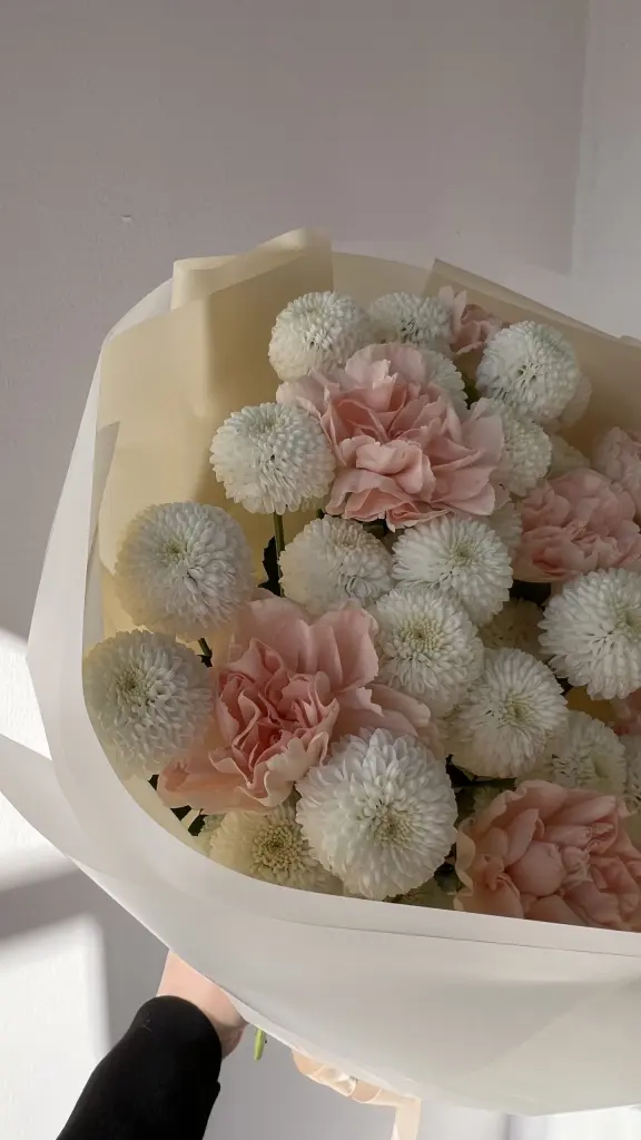 Нежный букет с Хризантемой Ньютон и Гвоздикой