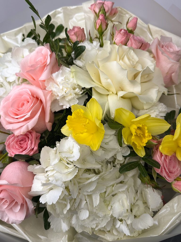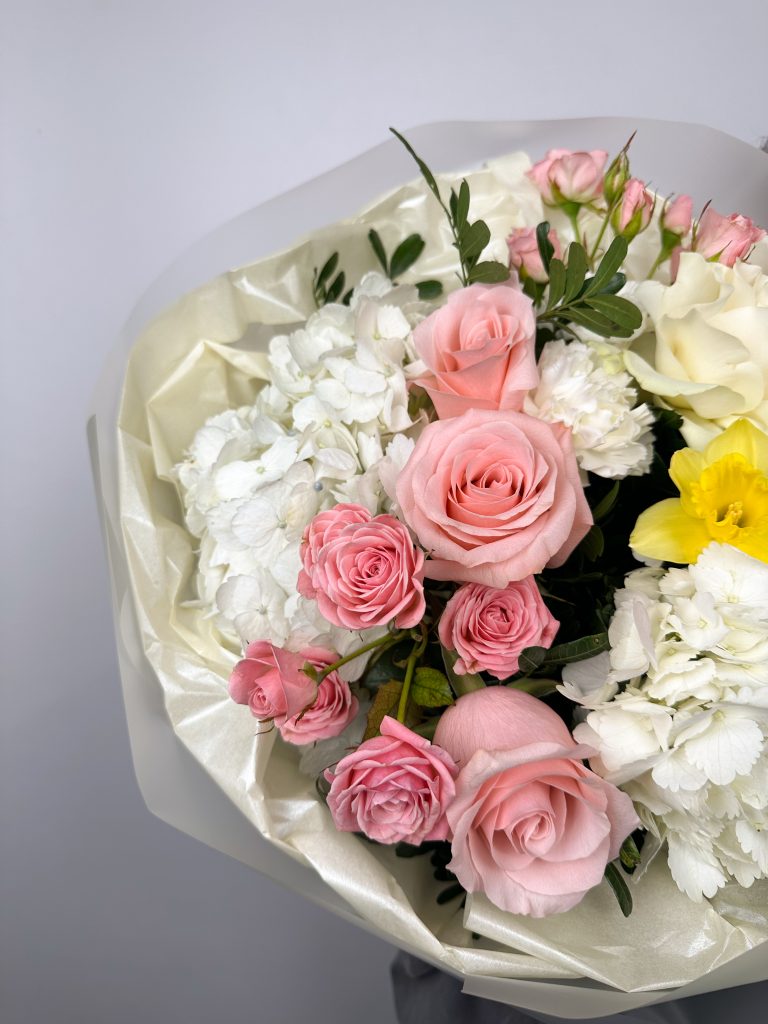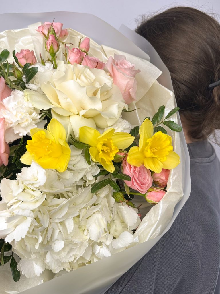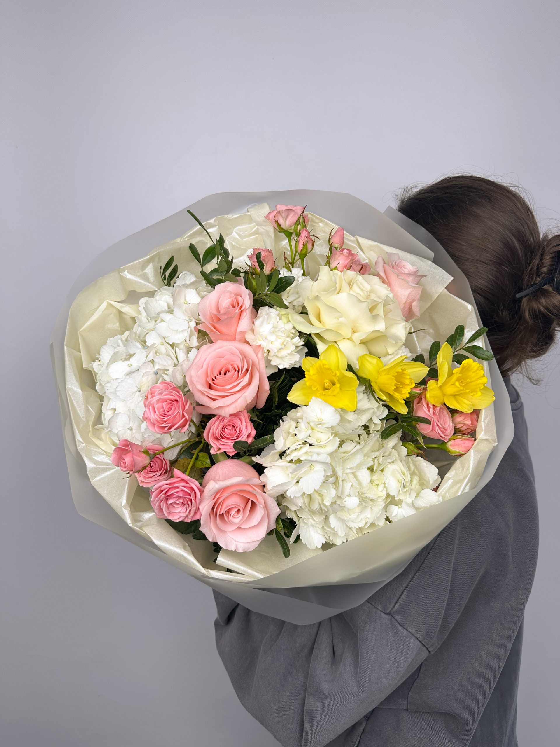 Нежный составной букет из белой гортензии, кустовой розы и нарциссов