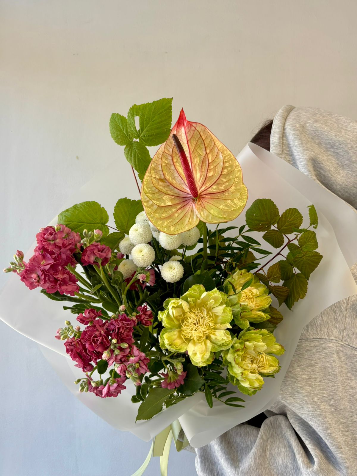 Яркий букет с антуриумом, зелёной розой и маттиолой