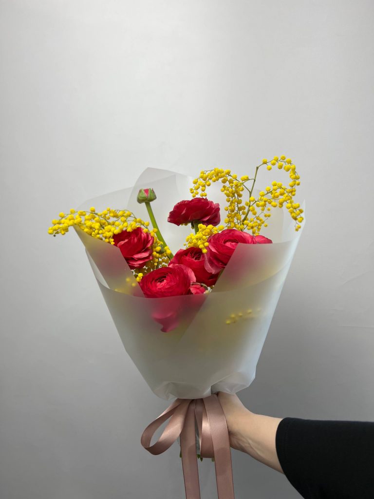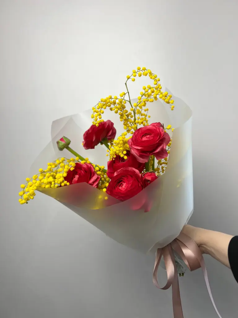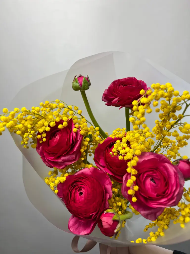 Яркий букет с мимозой и ранункулюсами