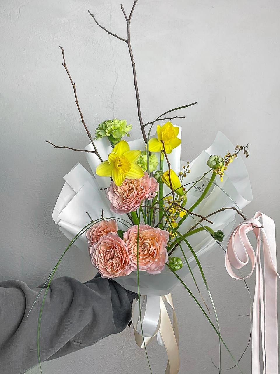 Яркий букет с ветками, нарциссами, игривым берграссом и пионовидной розой