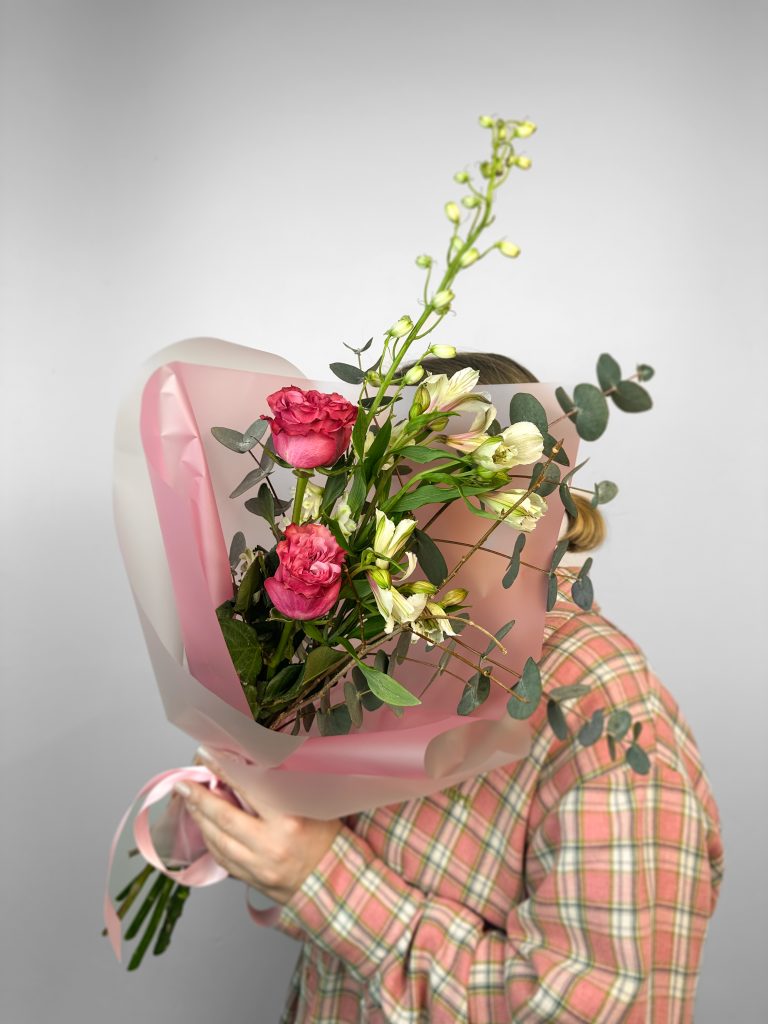 стойкий весенний сборный букет. Все букеты мы доставляем на аквапакетах. А в подарок даём подкормку и инструкцию по уходу за букетом.