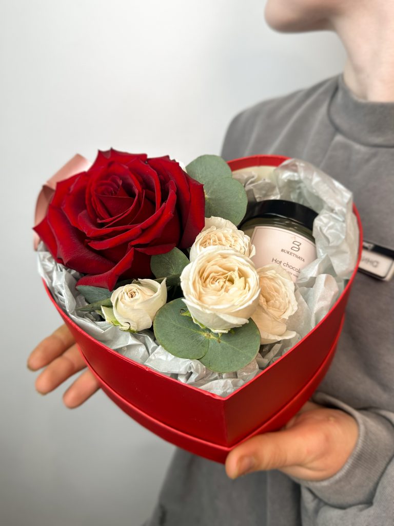 Яркий бокс с розами и авторской свечой. Все букеты и композиции мы доставляем на аквапакетах. А в подарок даём подкормку и инструкцию по уходу за букетом.