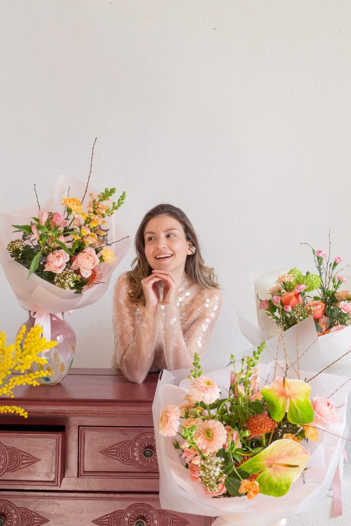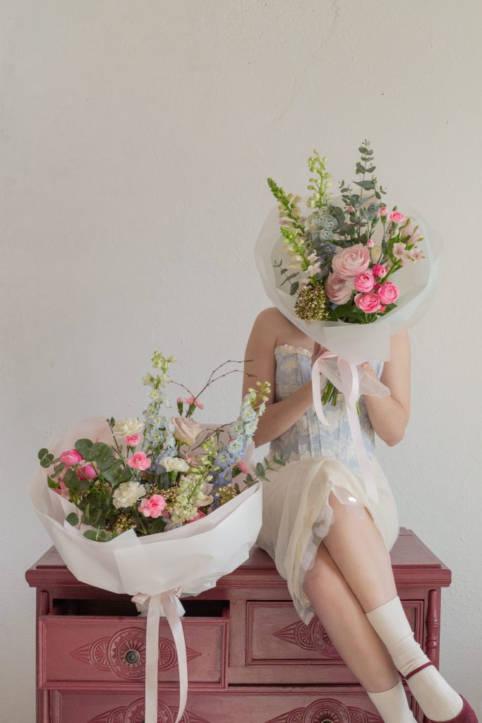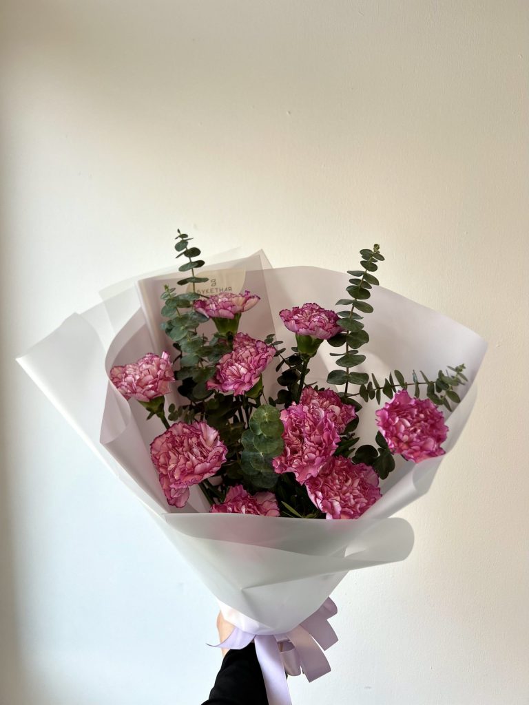 Монобукет из Диантусов с добавлением Экалипта. Все букеты мы доставляем на аквапакетах. А в подарок даём подкормку и инструкцию по уходу за букетом.