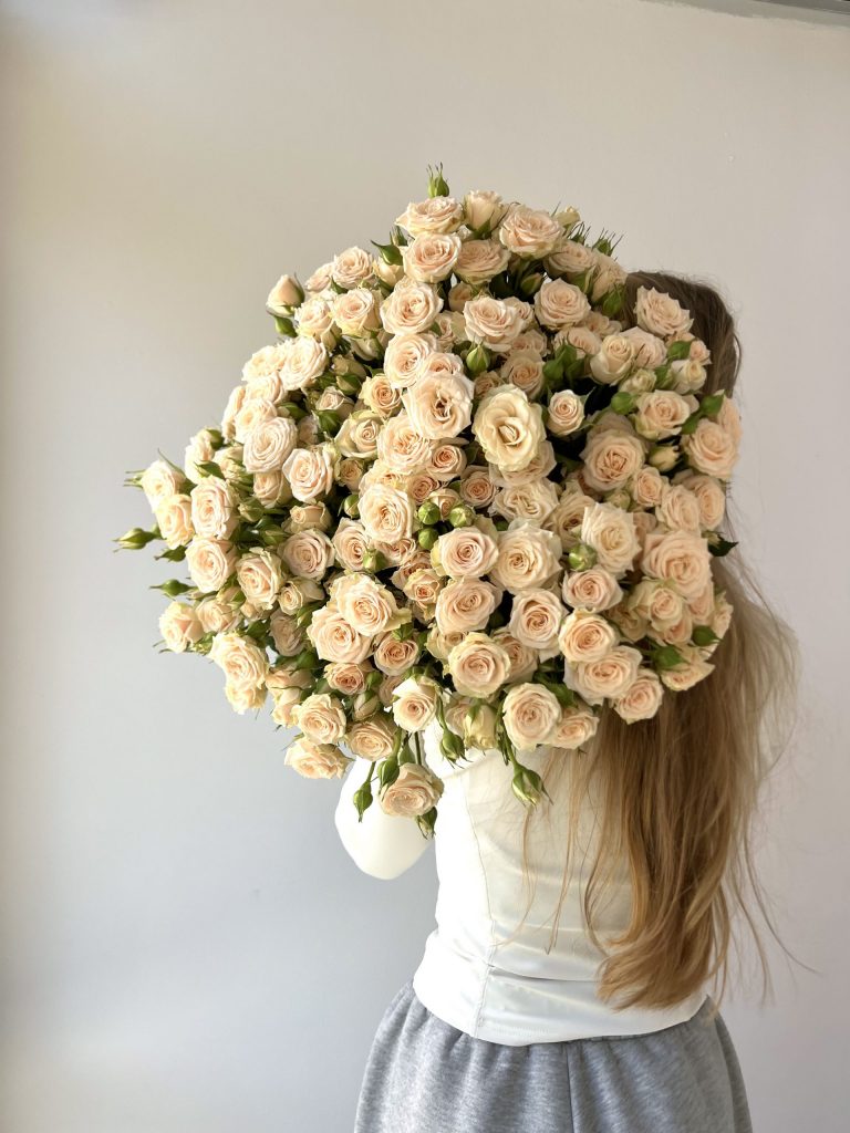 Монобукет из кустовой розы Сансерре. Все букеты мы доставляем на аквапакетах. А в подарок даём подкормку и инструкцию по уходу за букетом.