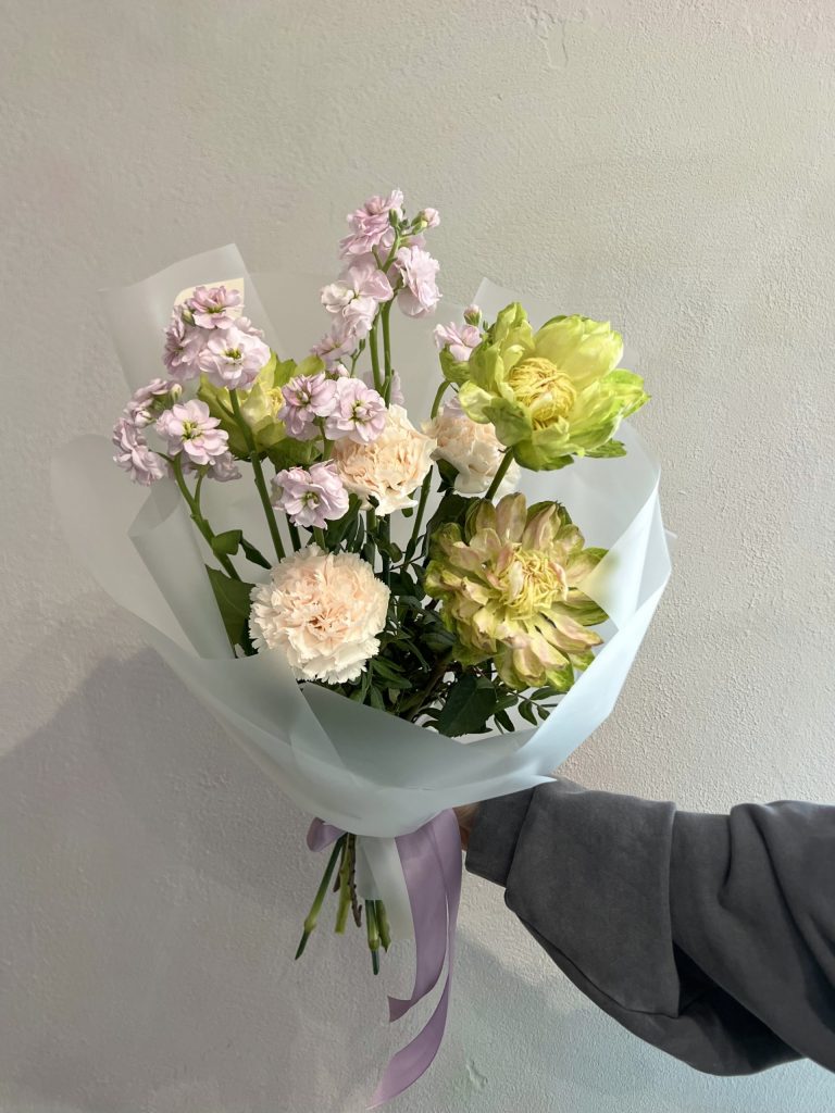 Составной букет в зеленой гамме с розой Вегги, кустовой Маттиолой и Гвоздикой Все букеты мы доставляем на аквапакетах. А в подарок даём подкормку и инструкцию по уходу за букетом.