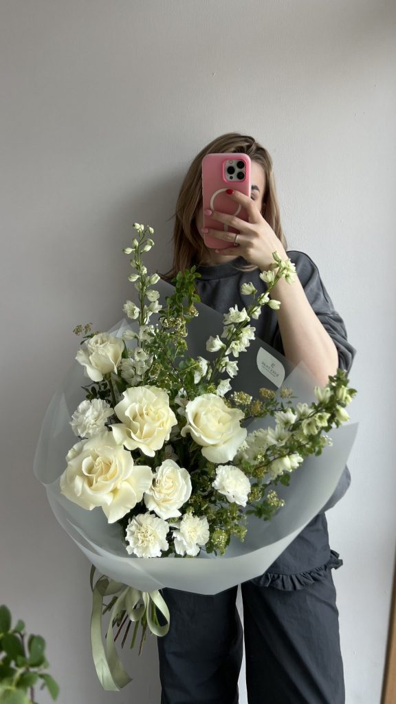 Составной букет в белой гамме. Все букеты мы доставляем на аквапакетах. А в подарок даём подкормку и инструкцию по уходу за букетом.