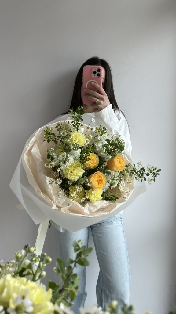 Монобукет из желтой кустовой розы «Бандолеро». Все букеты мы доставляем на аквапакетах. А в подарок даём подкормку и инструкцию по уходу за букетом.