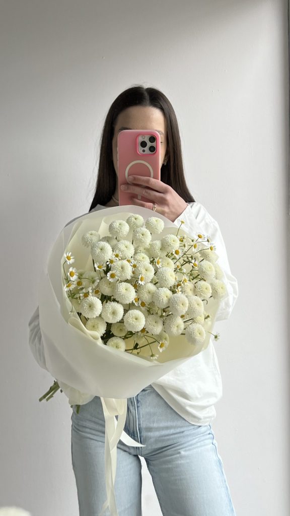 Моно букет из пышной хризантемы Алтай. Соберем любое количество под ваш бюджет. Все букеты мы доставляем на аквапакетах. А в подарок даём подкормку и инструкцию по уходу за букетом